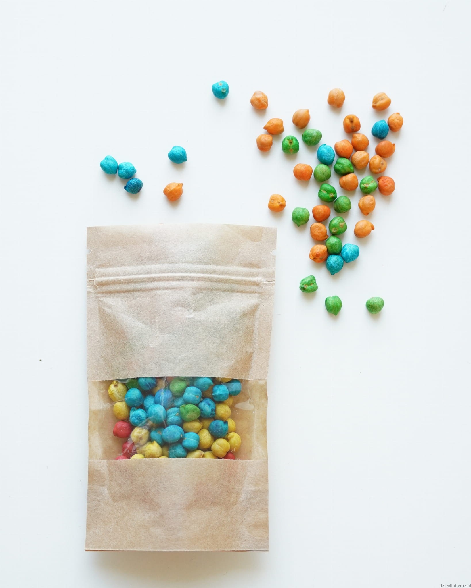 Opakowanie ciecierzycy barwionej naturalnymi barwnikami spożywczymi (oraz bezpiecznymi farbami akrylowymi: kolor biały) 200g, średnica ziaren 8mm.