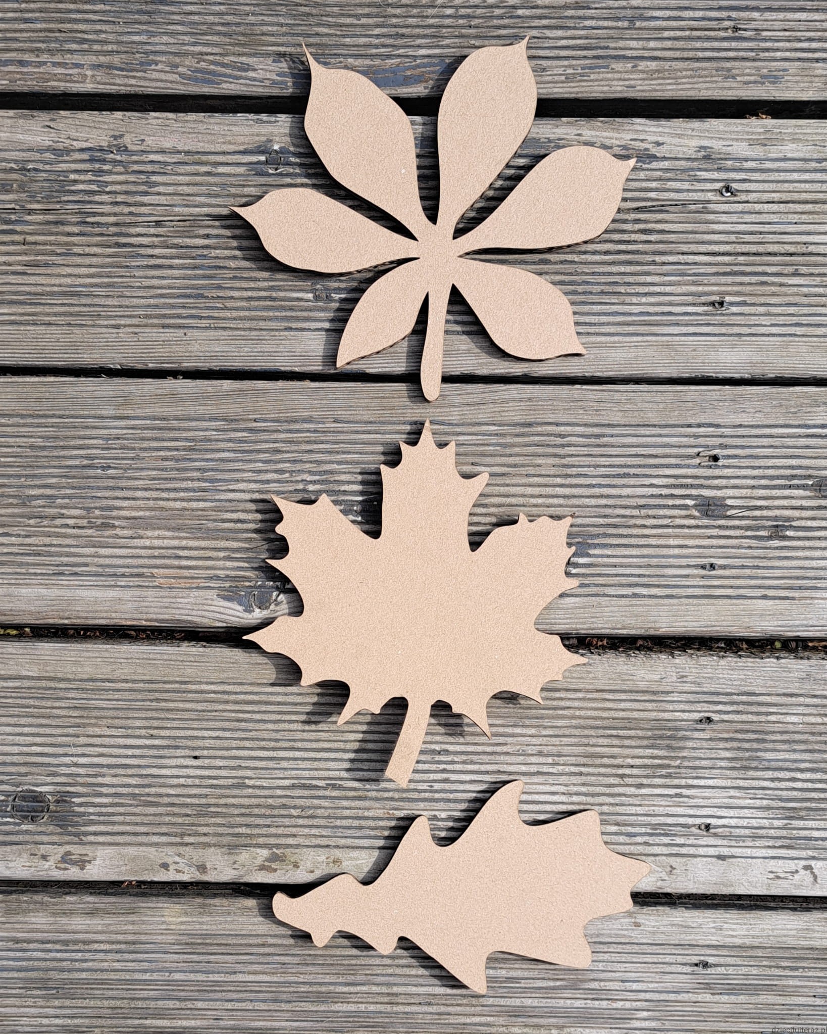 Zestaw 3 kartoników do dekoracji: liść klonu, dębu i kasztanowca.