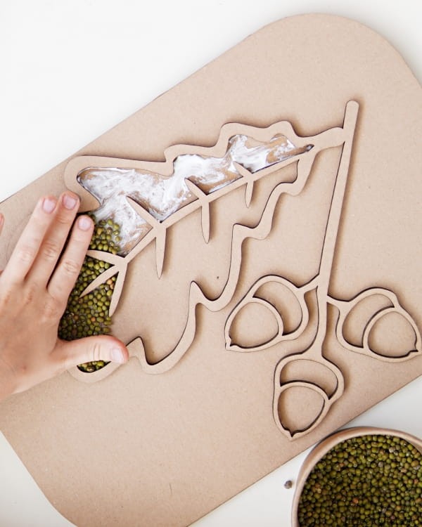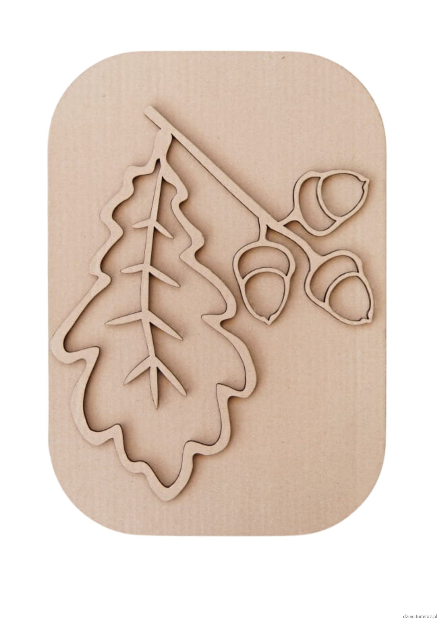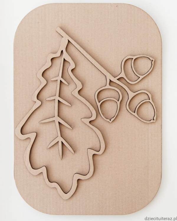 Sensokarton z liściem dębu i trzema żołędziami, o wymiarach 39cm x 27cm, pasuje na stolik flisat i pojemnik trofast z Ikei.