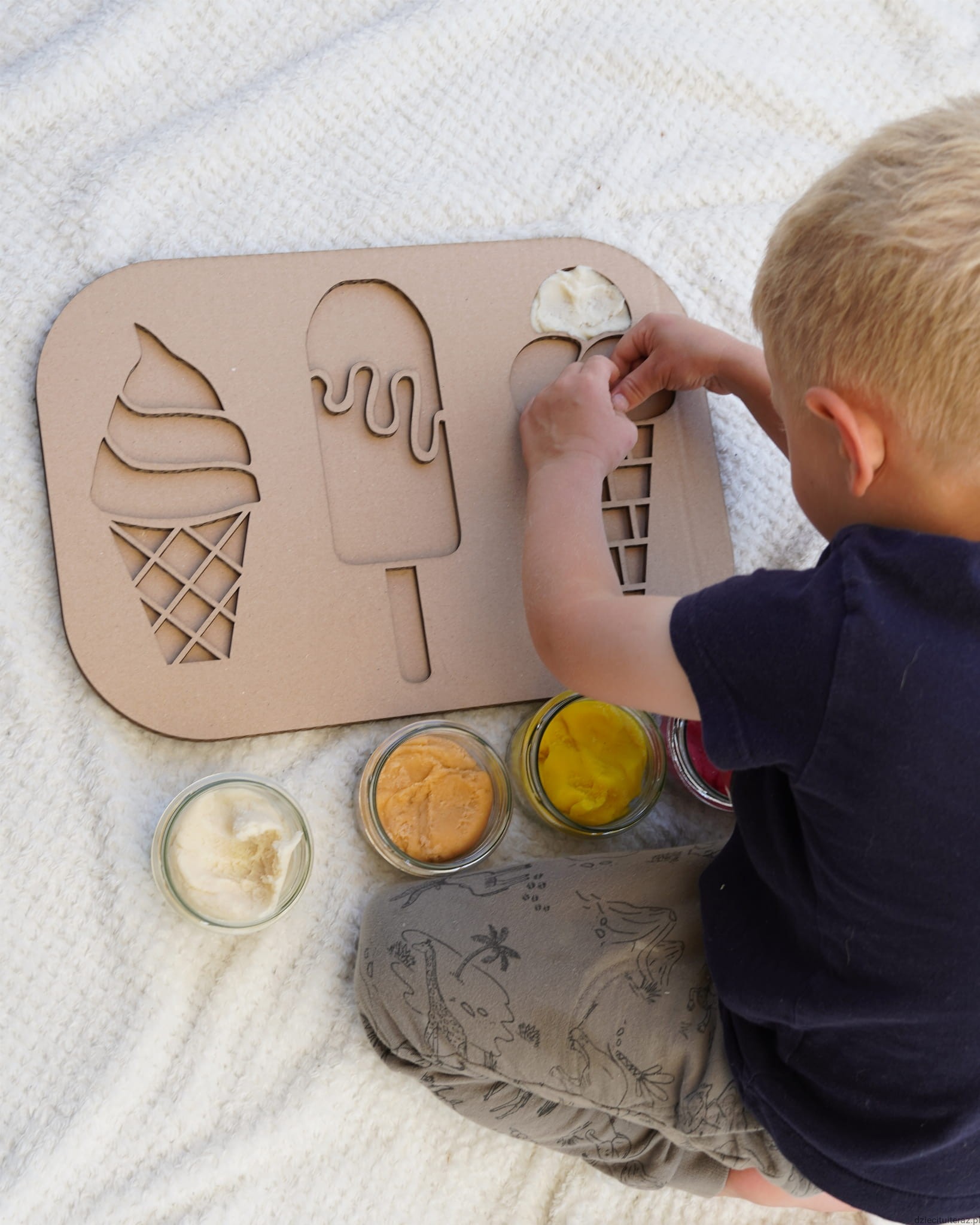 Kartonowy model trzech lodów na podkładce prostokątnej o wymiarach 39,5cm x 27,5cm (gruba tektura dwuwarstwowa).