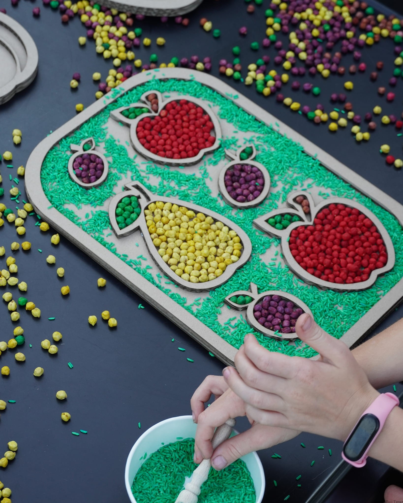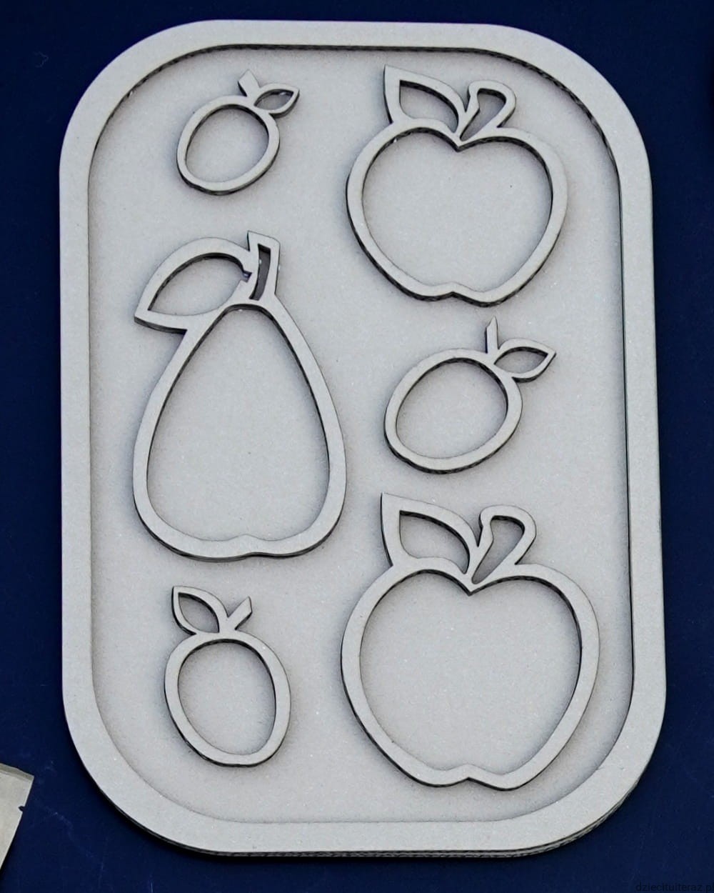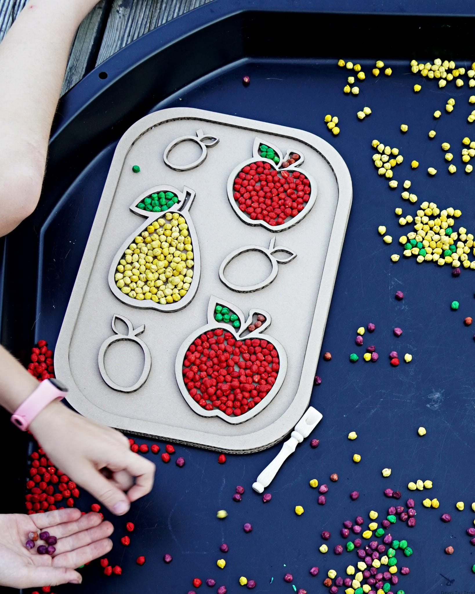Sensokarton z owocami o wymiarach 39cm x 27cm.