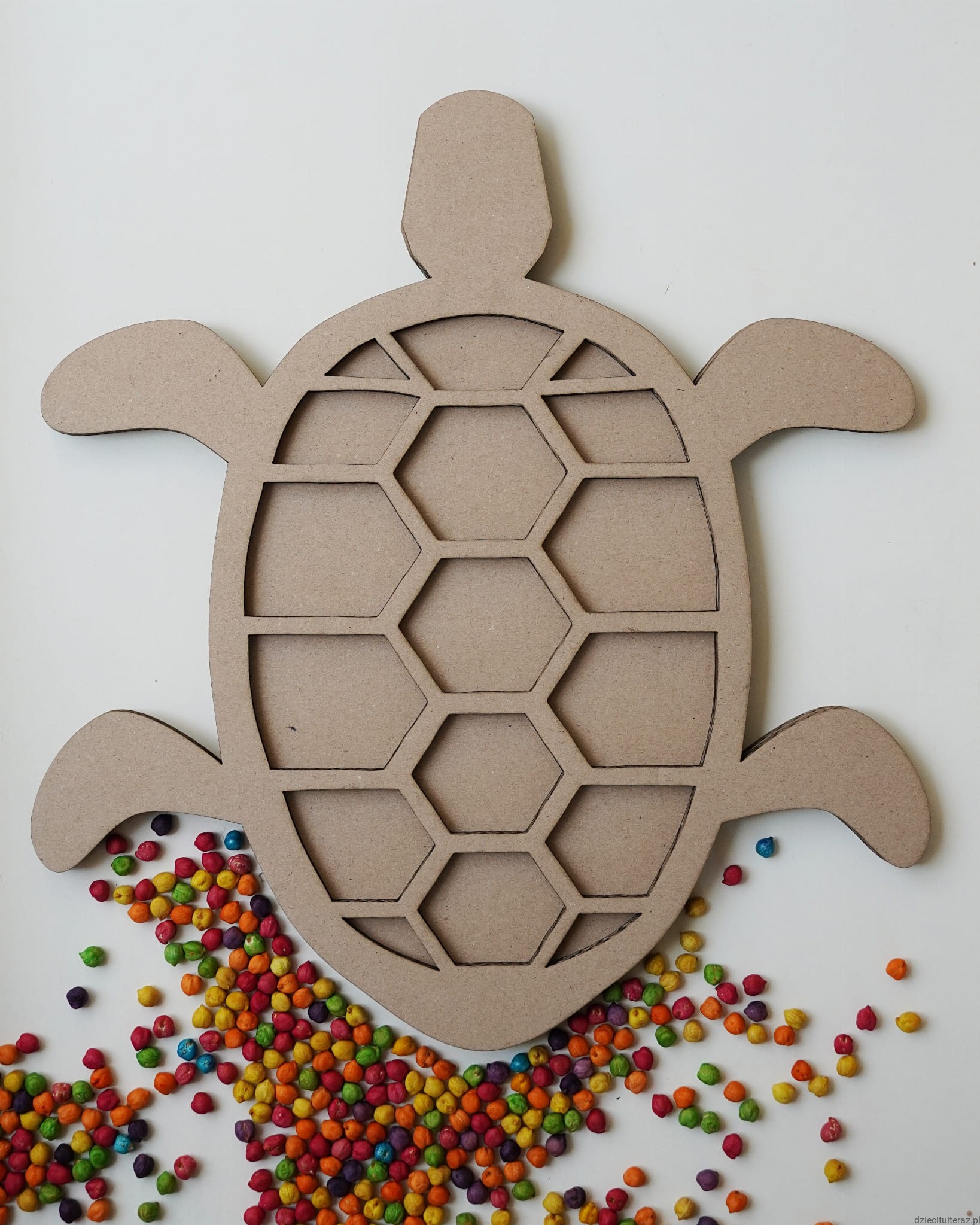 Kartonowy model żółwia o wymiarach 36cm x 34cm.