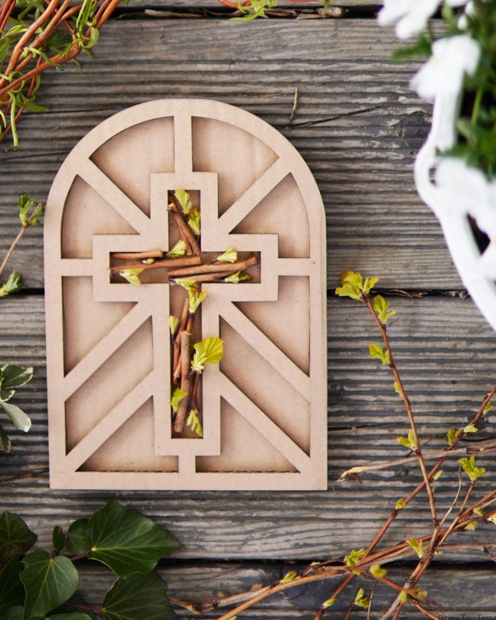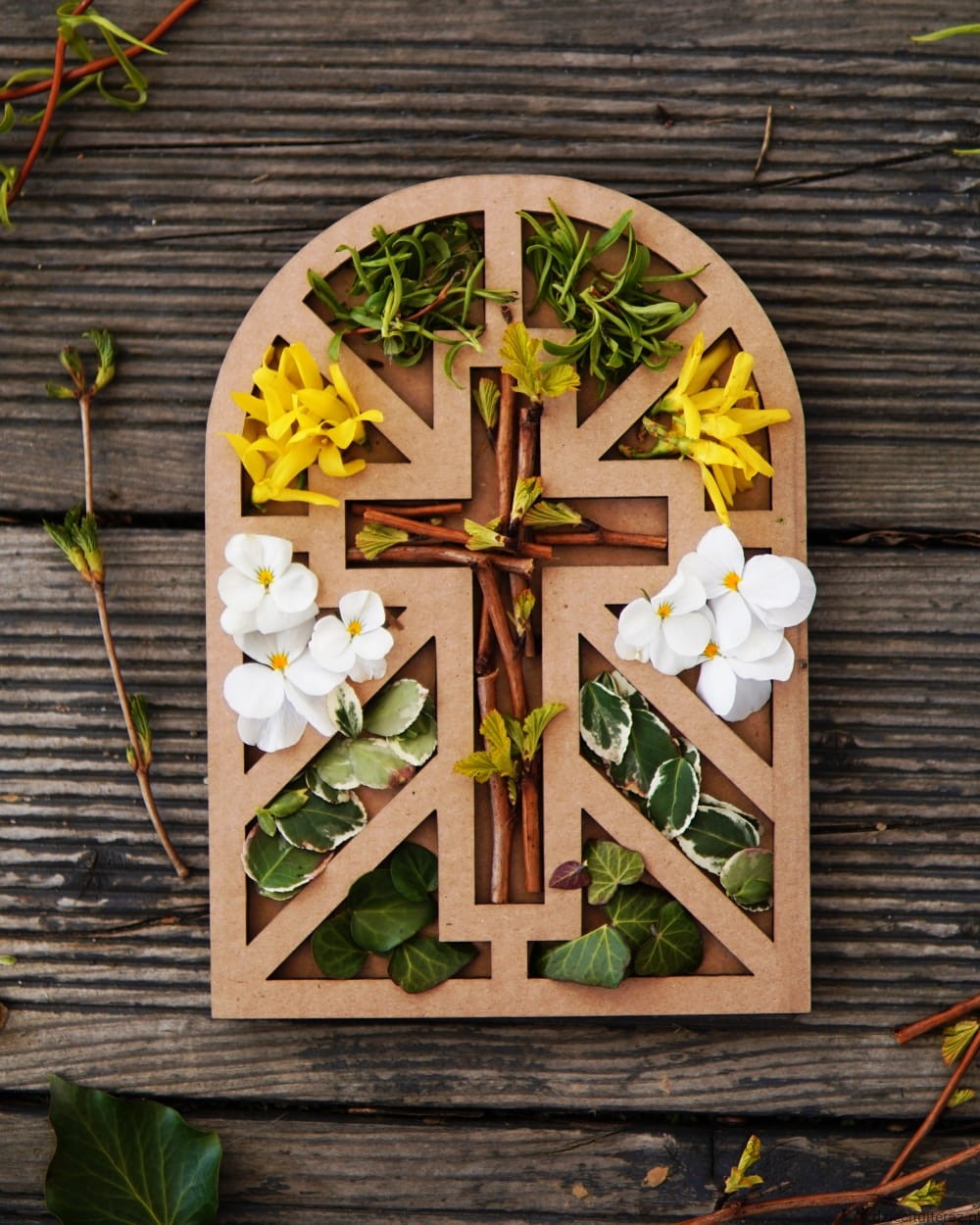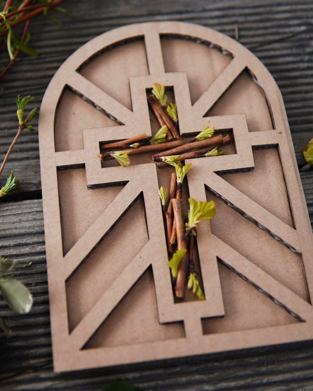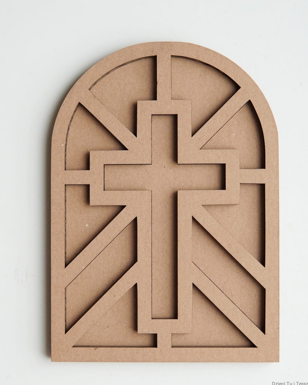 Sensokarton w kształcie okna z witrażem o wymiarach: 21 cm x 15cm.