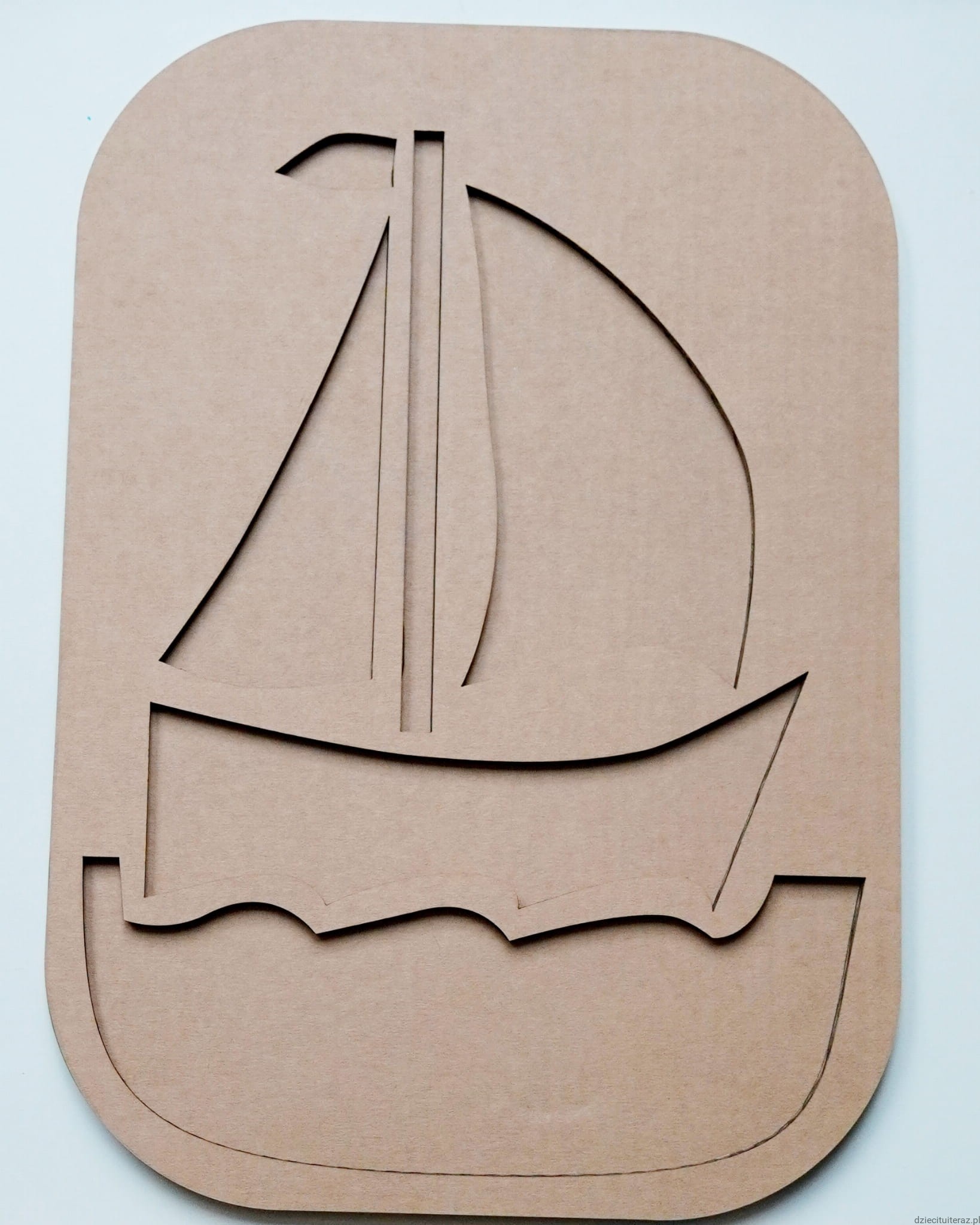 Kartonowy model żaglówki o wymiarach około  39 cm x 27 cm. Wykonany z dwóch warstw grubej tektury pięciowarstwowej. Grubość sensokartonu około 12 mm.