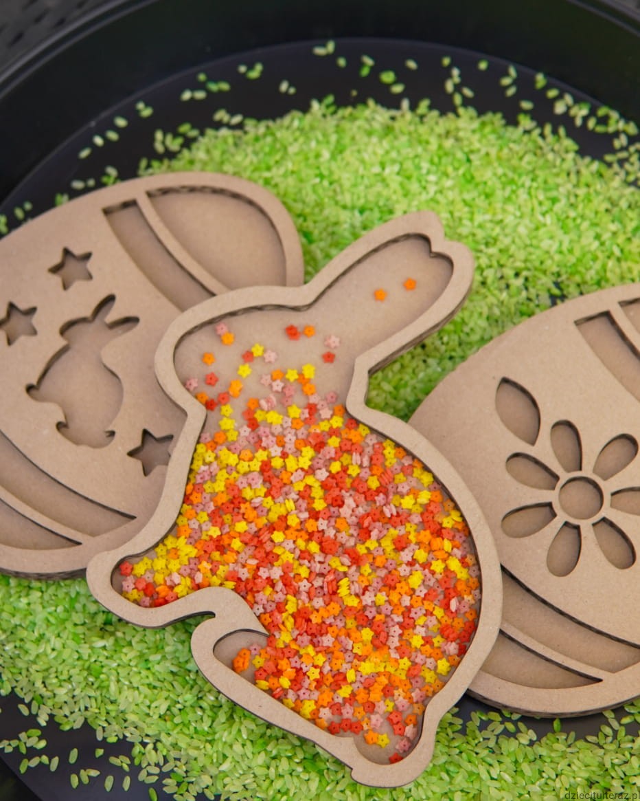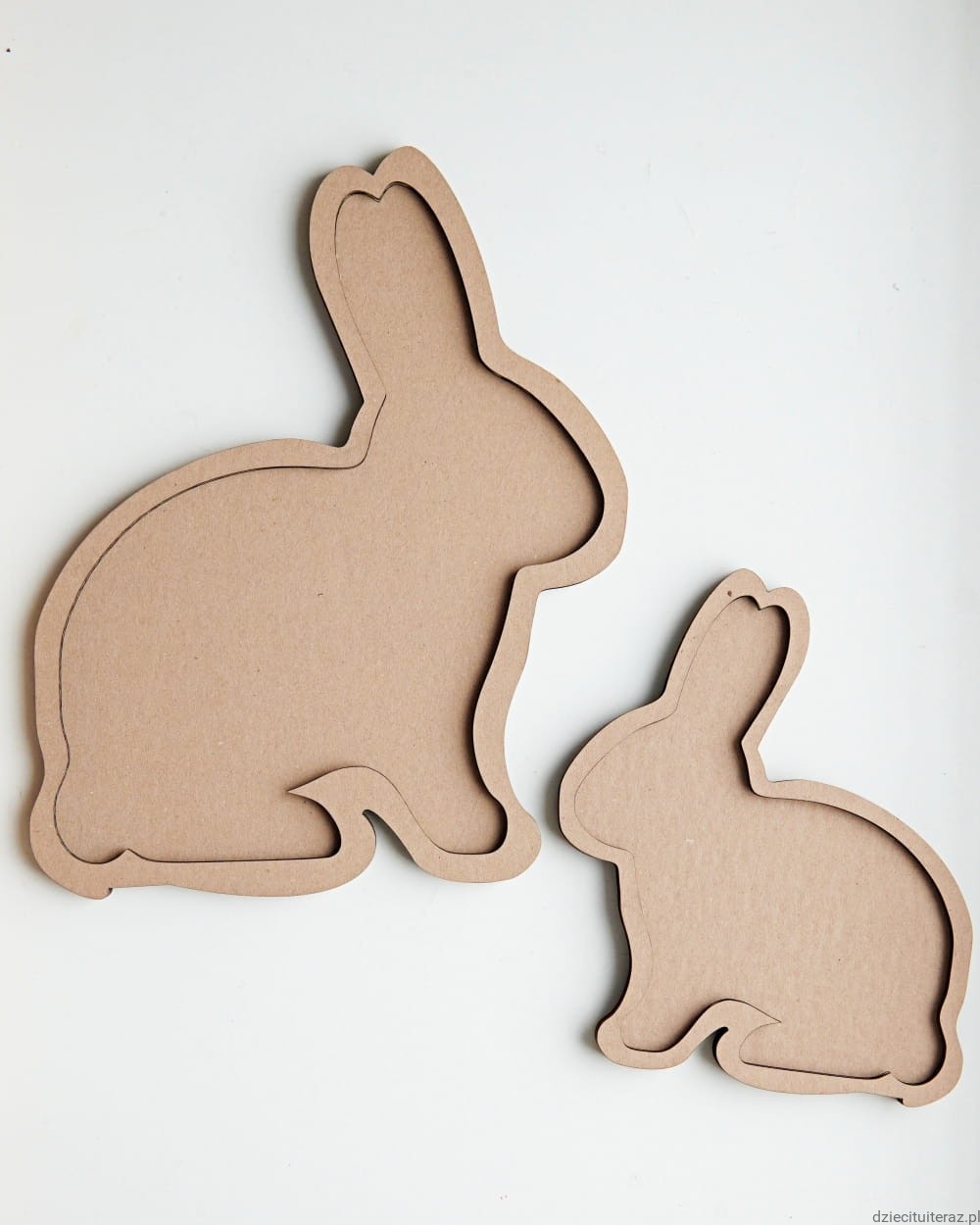 Zestaw 2 sensokartonów w kształcie zajączków: mały 20cm x 17cm i duży 29cm x 24cm.