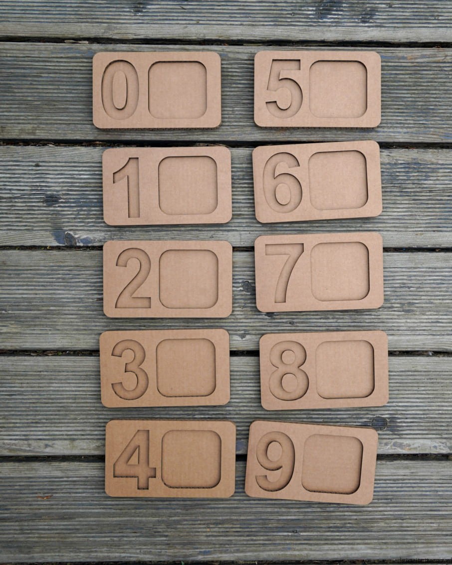 Sensokartony z cyframi i z polem do układania małych  przedmiotów.