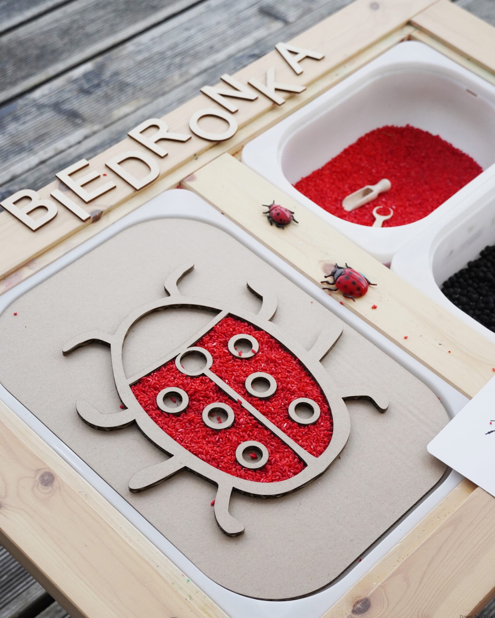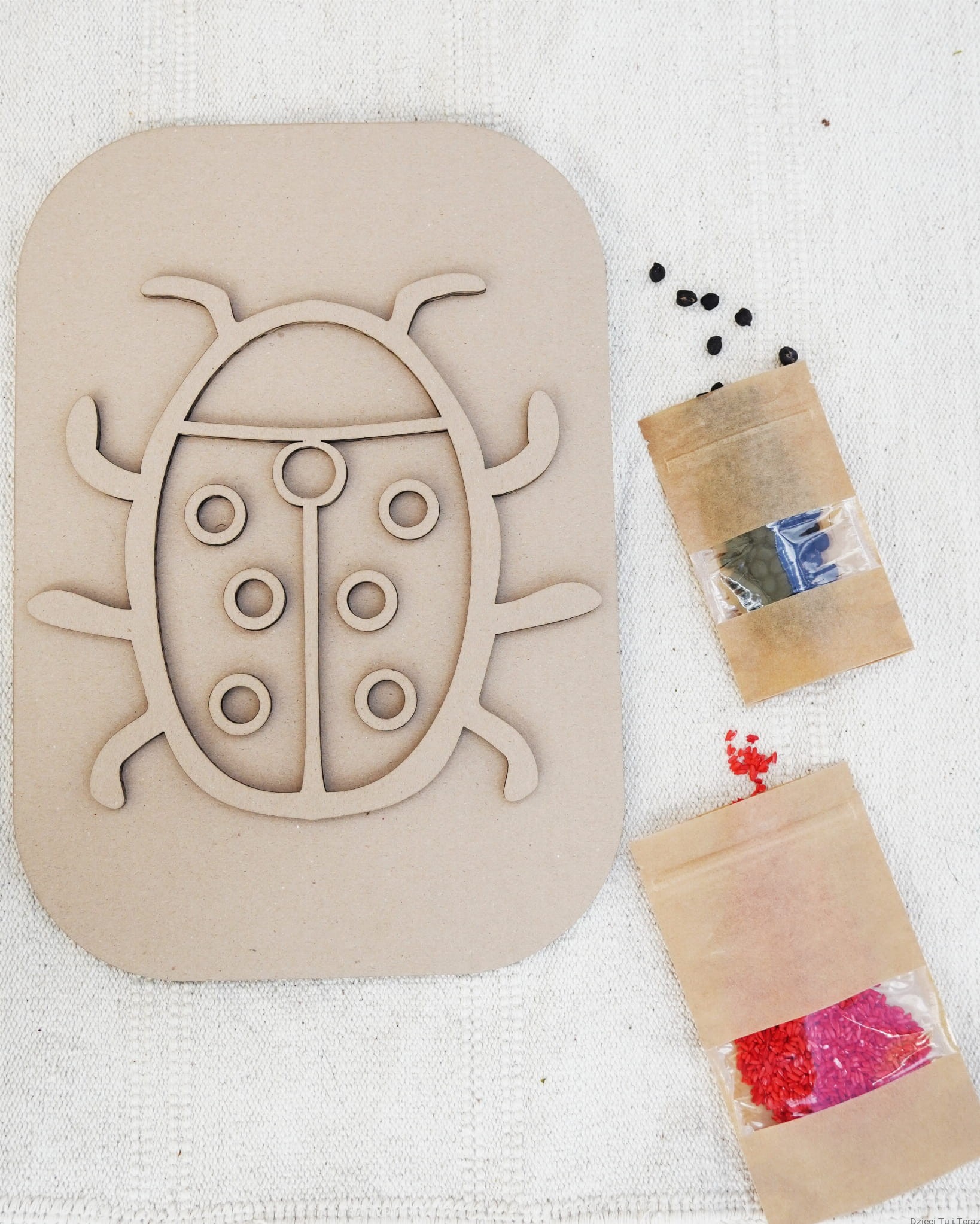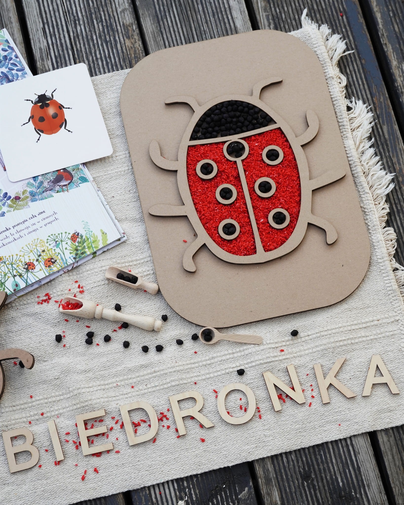 Zestaw składa się z kartonowego modelu biedronki na podkładce prostokątnej oraz jednego opakowania barwionej ciecierzycy i jednego opakowania barwionego ryżu. Zestaw zawiera 100g barwionych nasion ciecierzycy w kolorze czarnym oraz 150g ryżu w kolorze czerwonym. Nasiona ciecierzycy są barwione bezpiecznymi barwnikami spożywczymi.