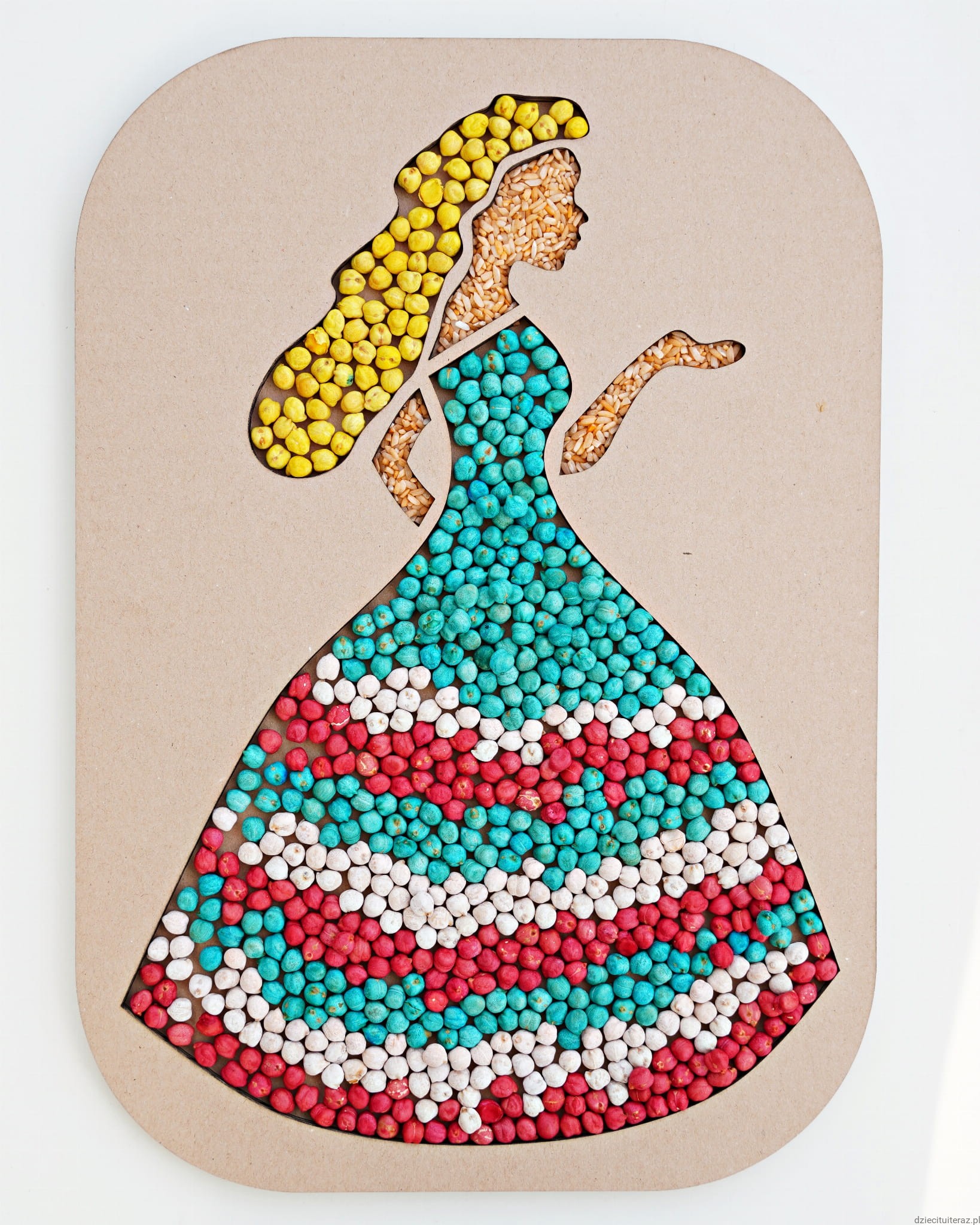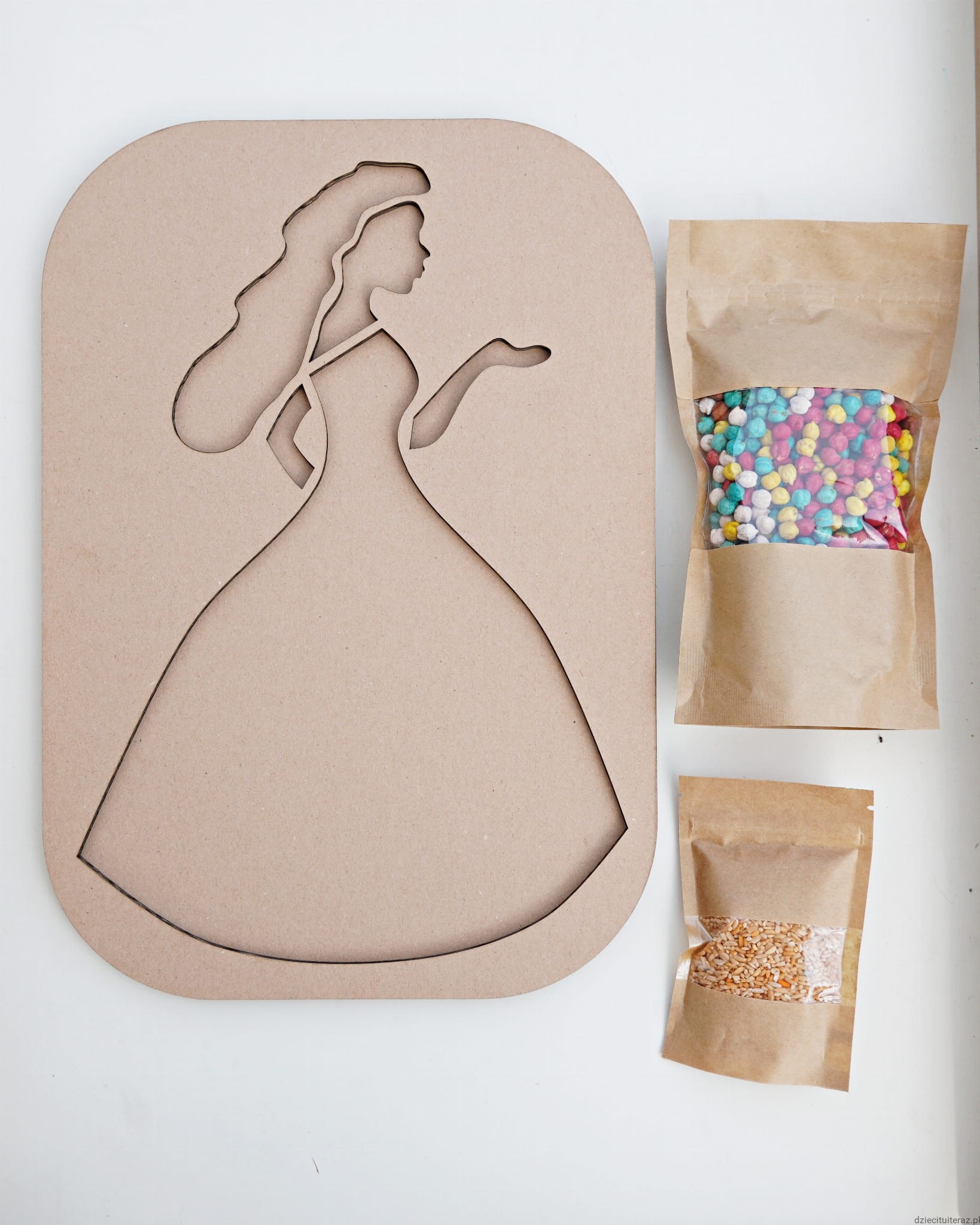 Zestaw składa się z kartonowego modelu damy oraz jednego opakowania barwionego ryżu i jednego opakowania barwionej ciecierzycy. Zestaw zawiera 50g nasion beżowego ryżu i 250g ciecierzycy w różnych kolorach. Nasiona są barwione bezpiecznymi barwnikami spożywczymi.