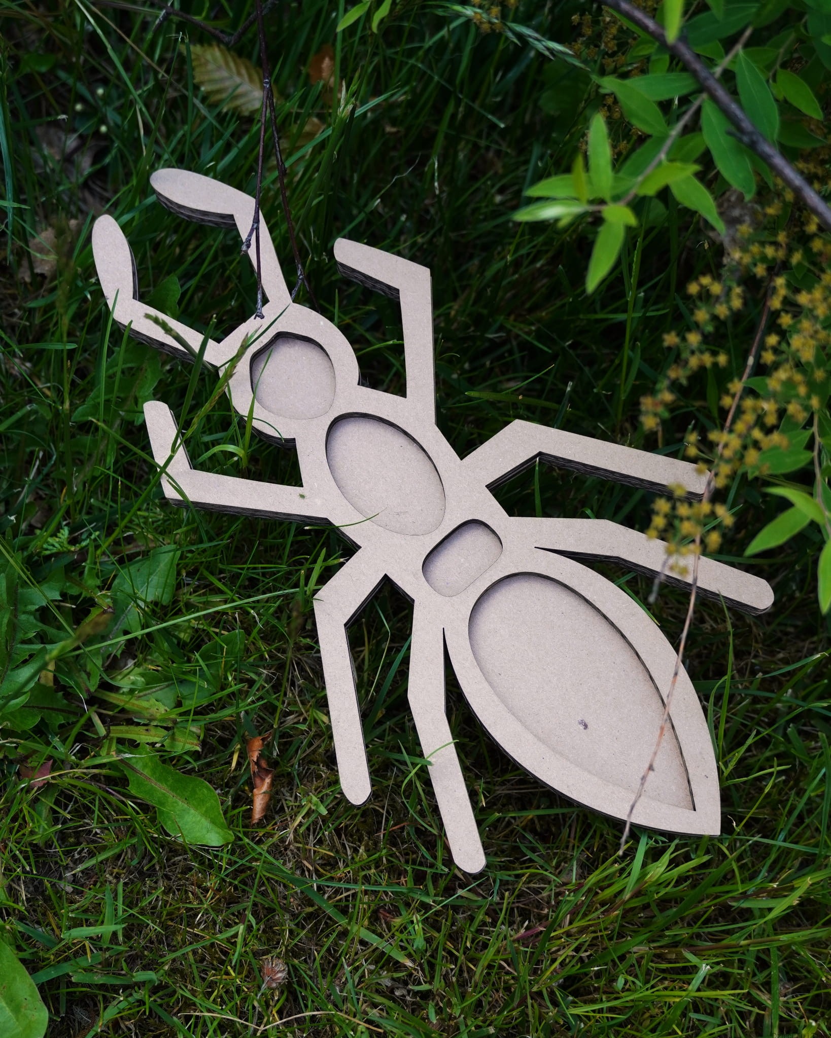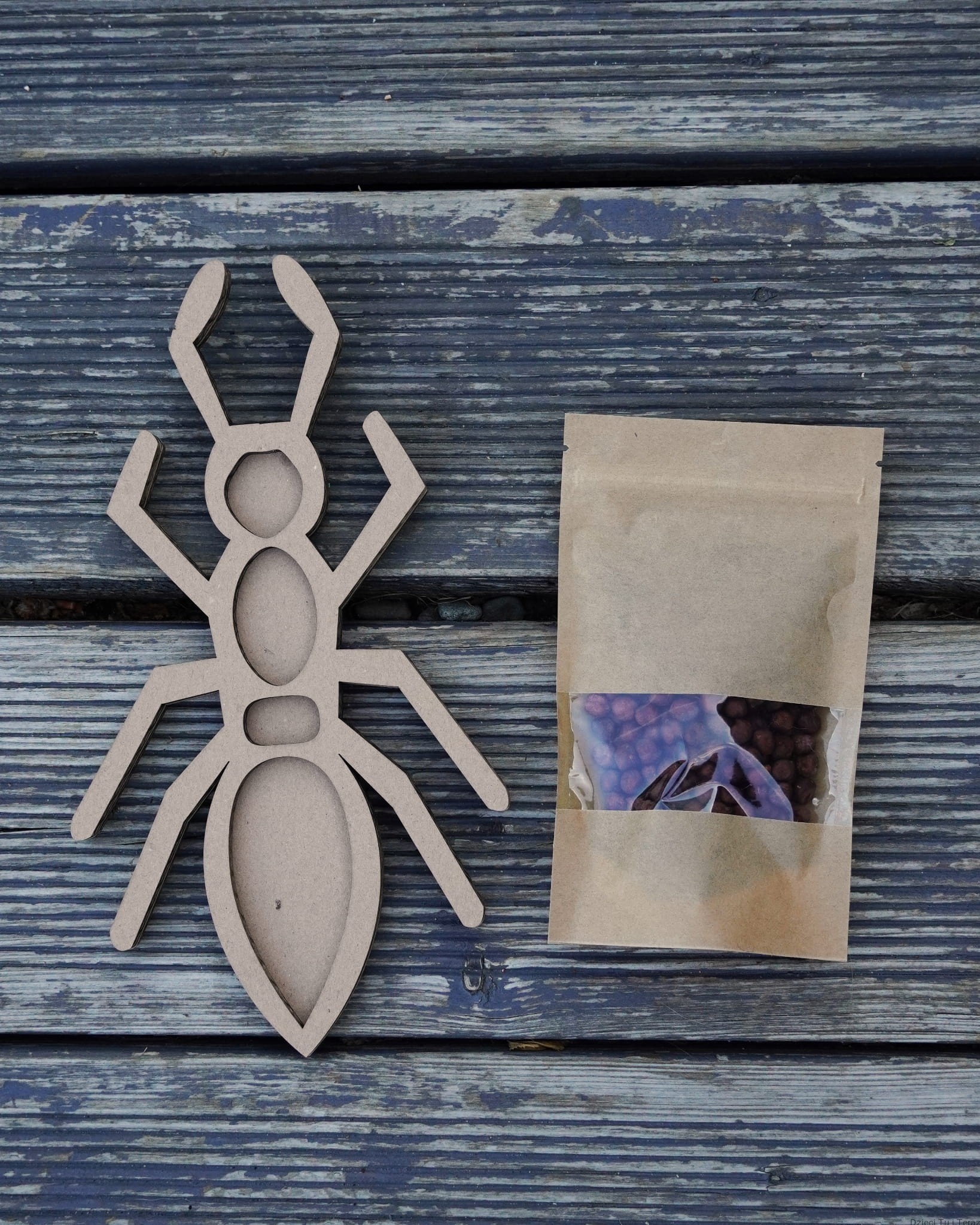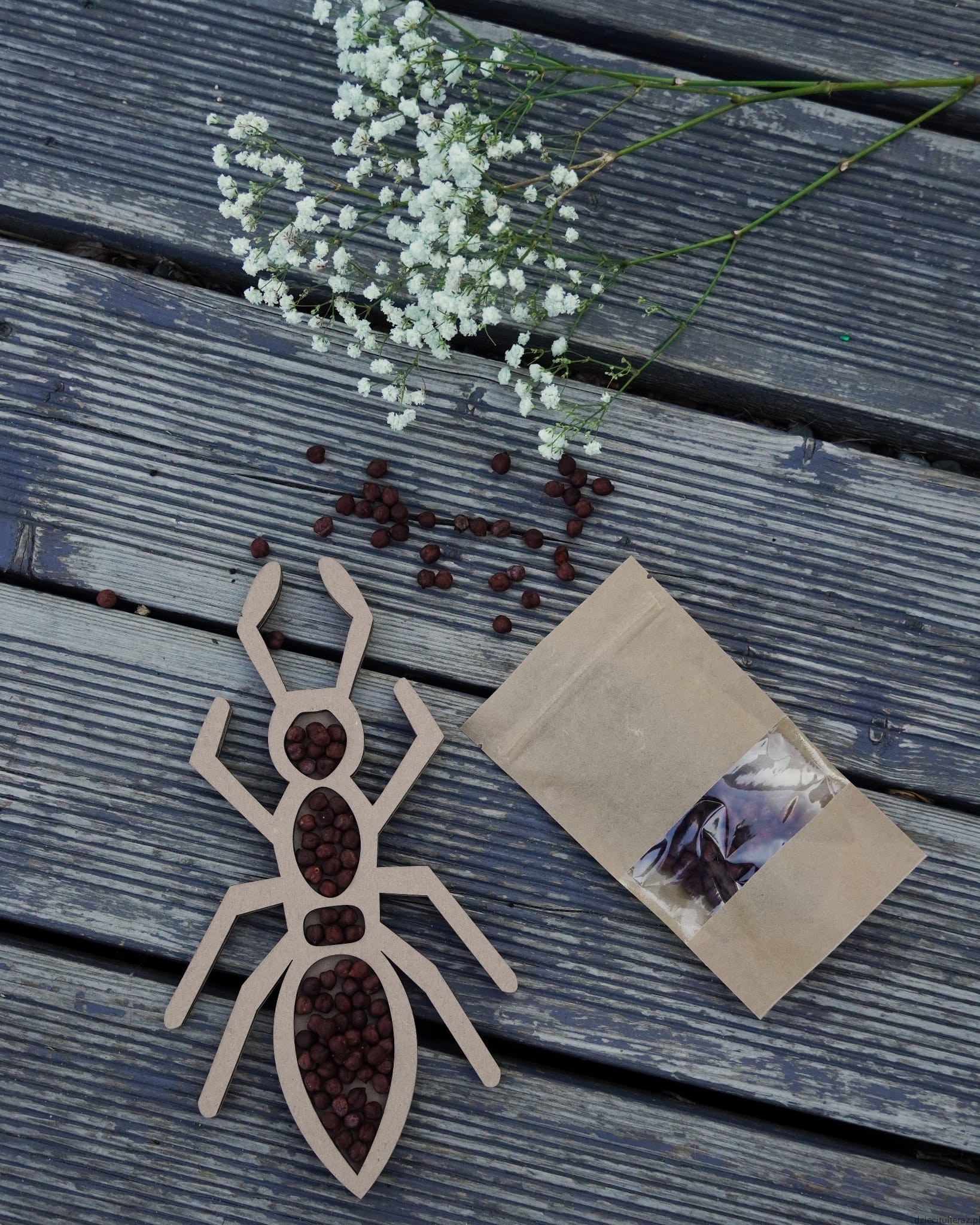 - kartonowy model mrówki z podkładką w kształcie mrówki o wymiarach 28cm x 15cm (gruba tektura dwuwarstwowa)