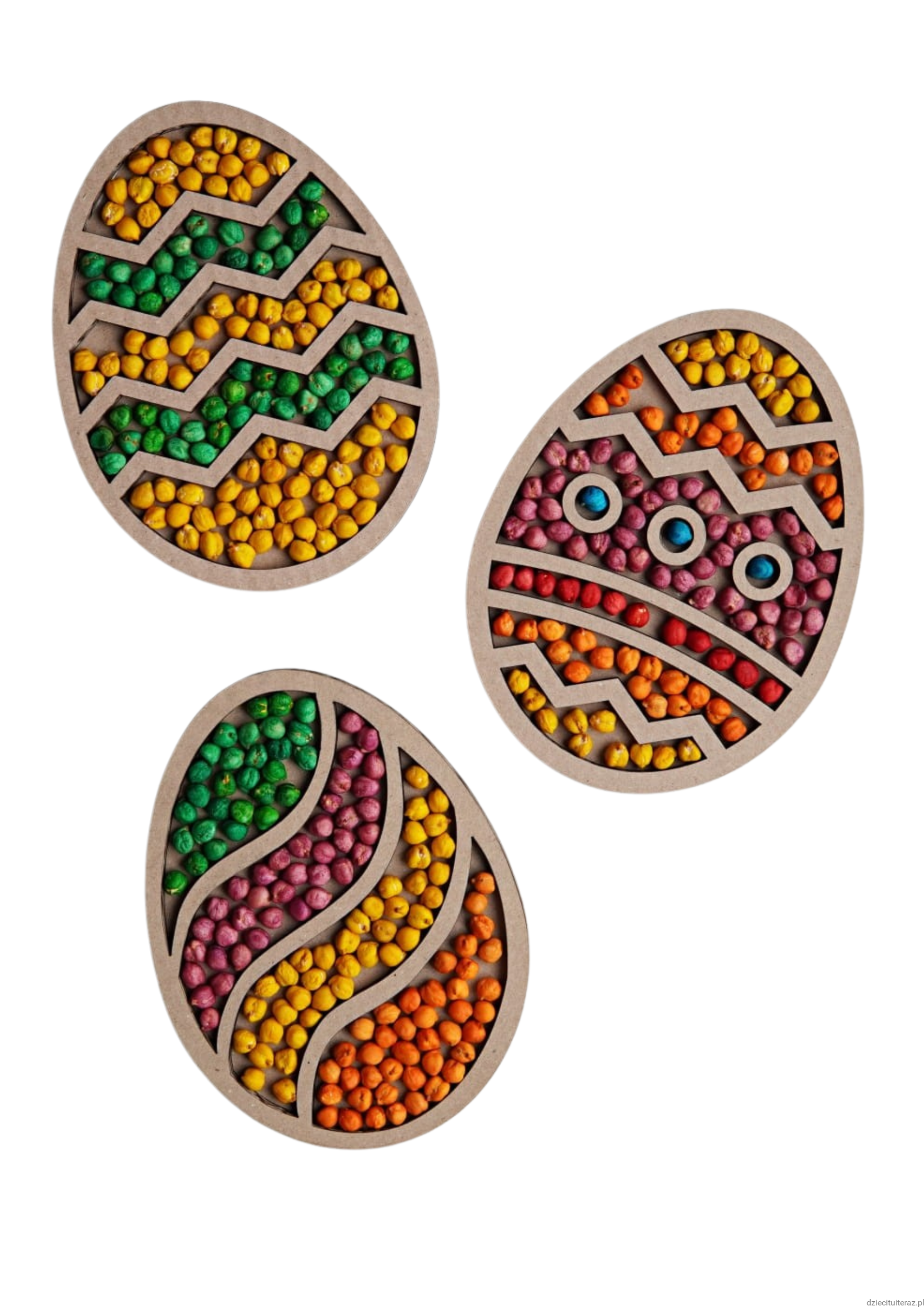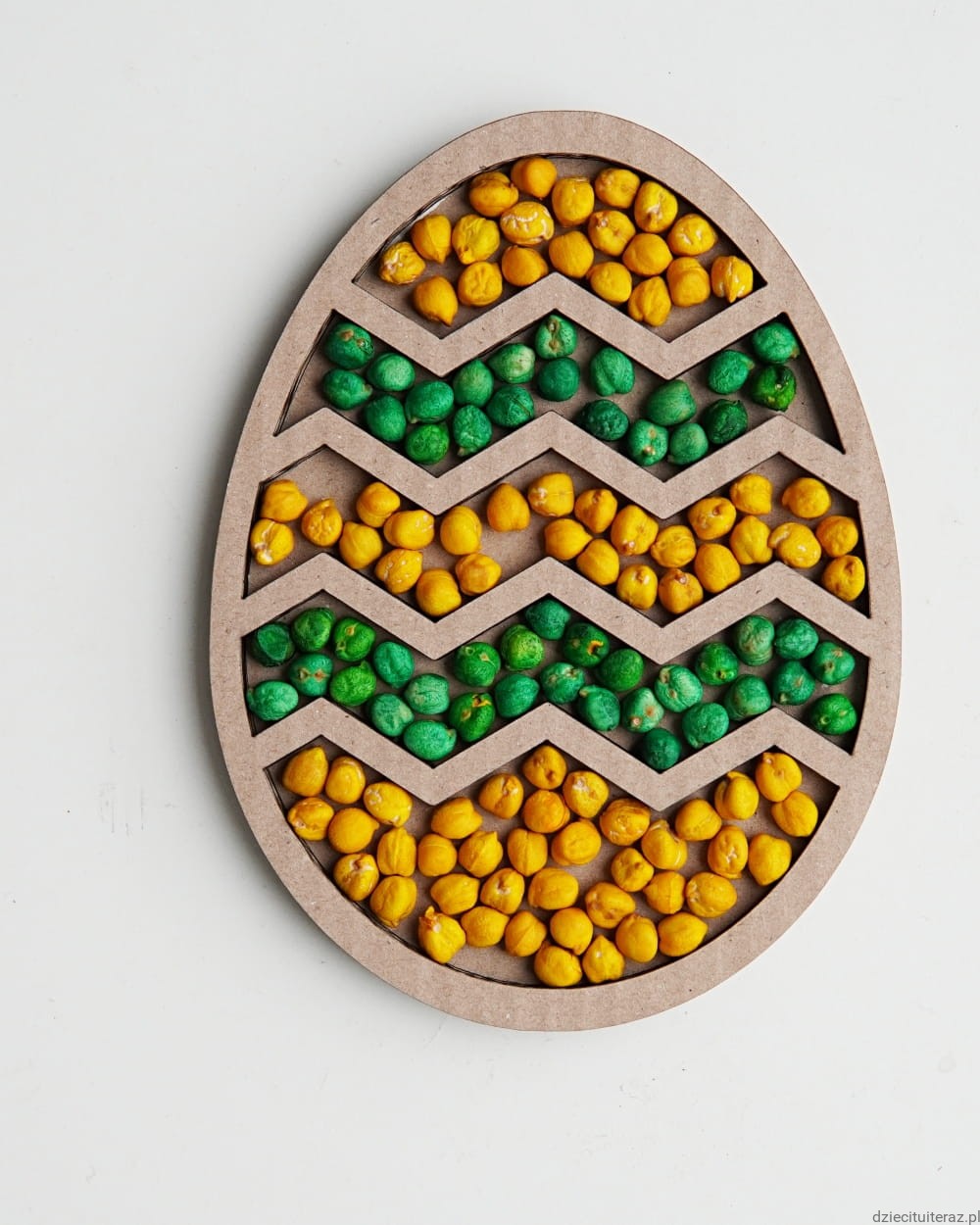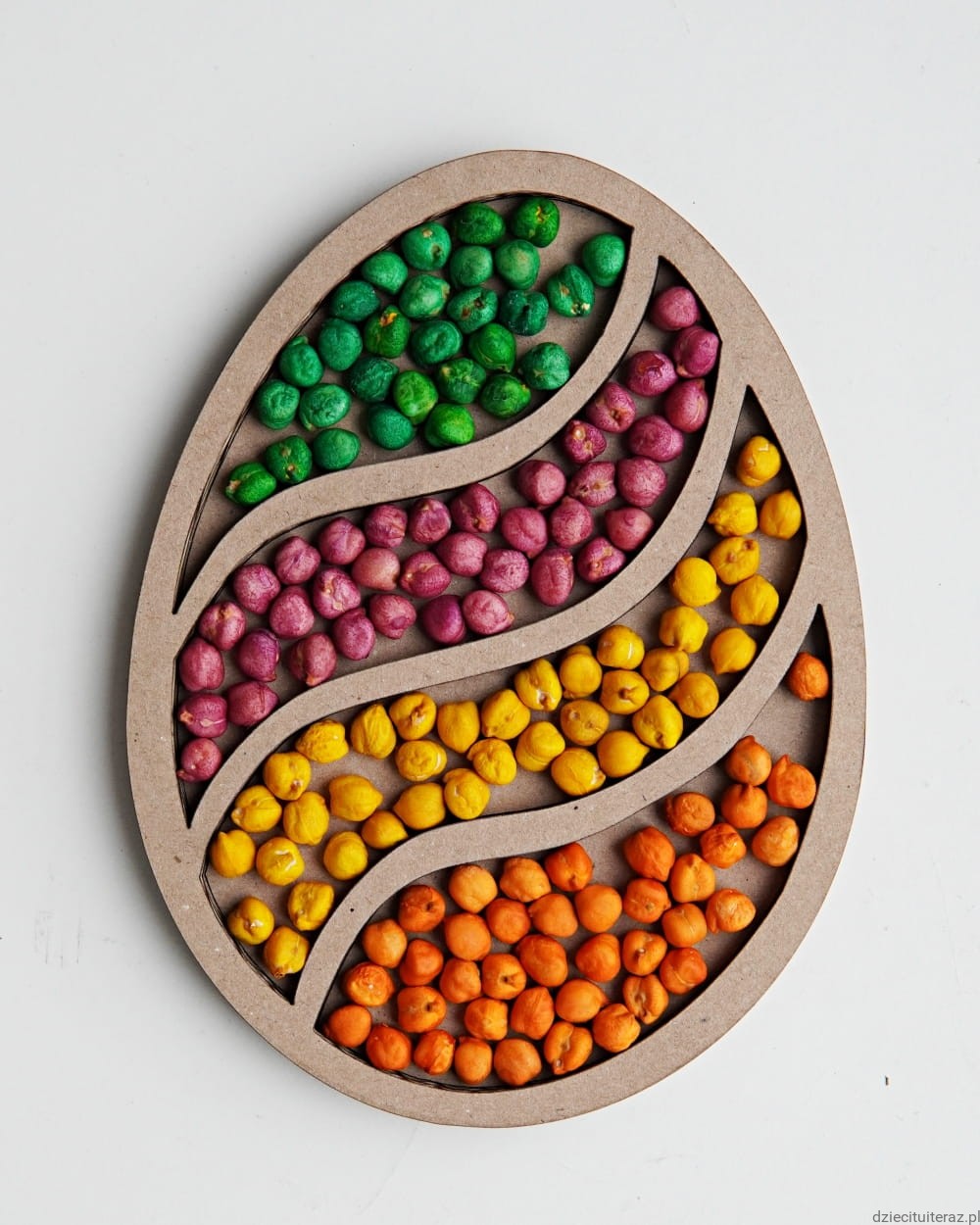 Zestaw składa się z kartonowej wysypywanki sensorycznej oraz jednego opakowania barwionej ciecierzycy.