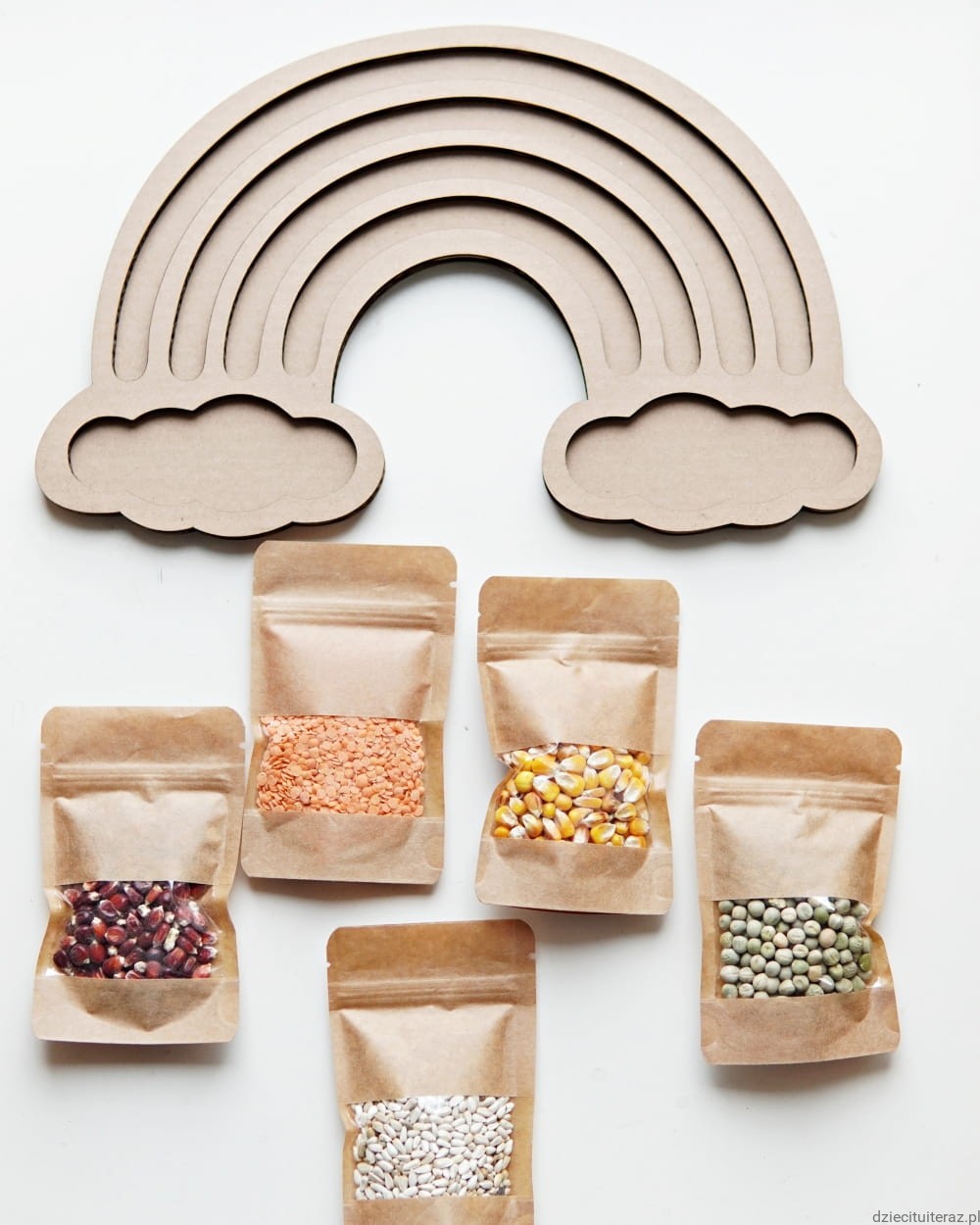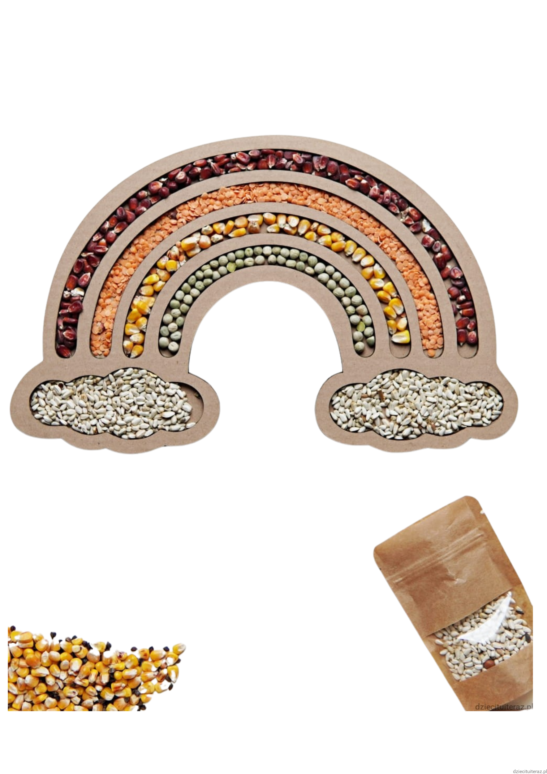 Zestaw składa się z kartonowej wysypywanki sensorycznej oraz 4 opakowań naturalnych ziaren.