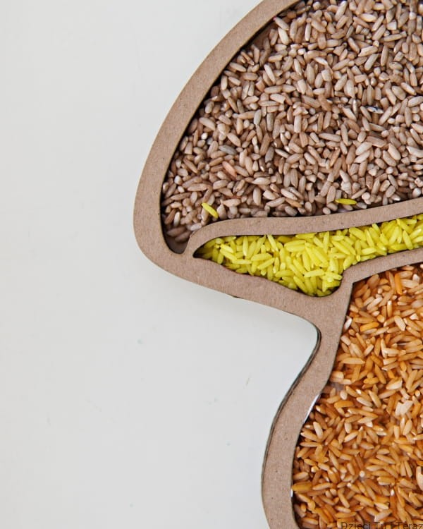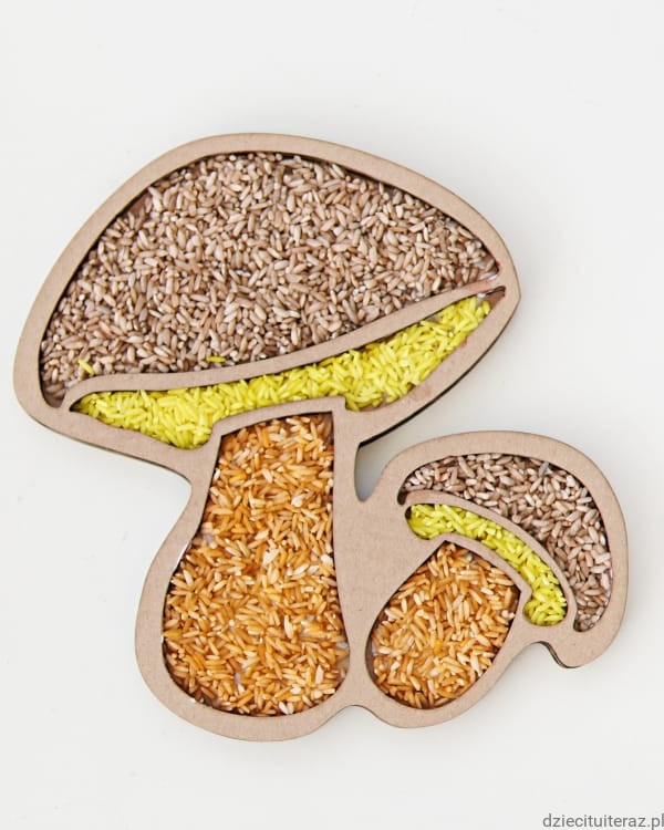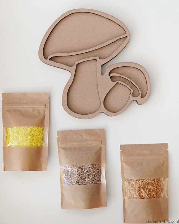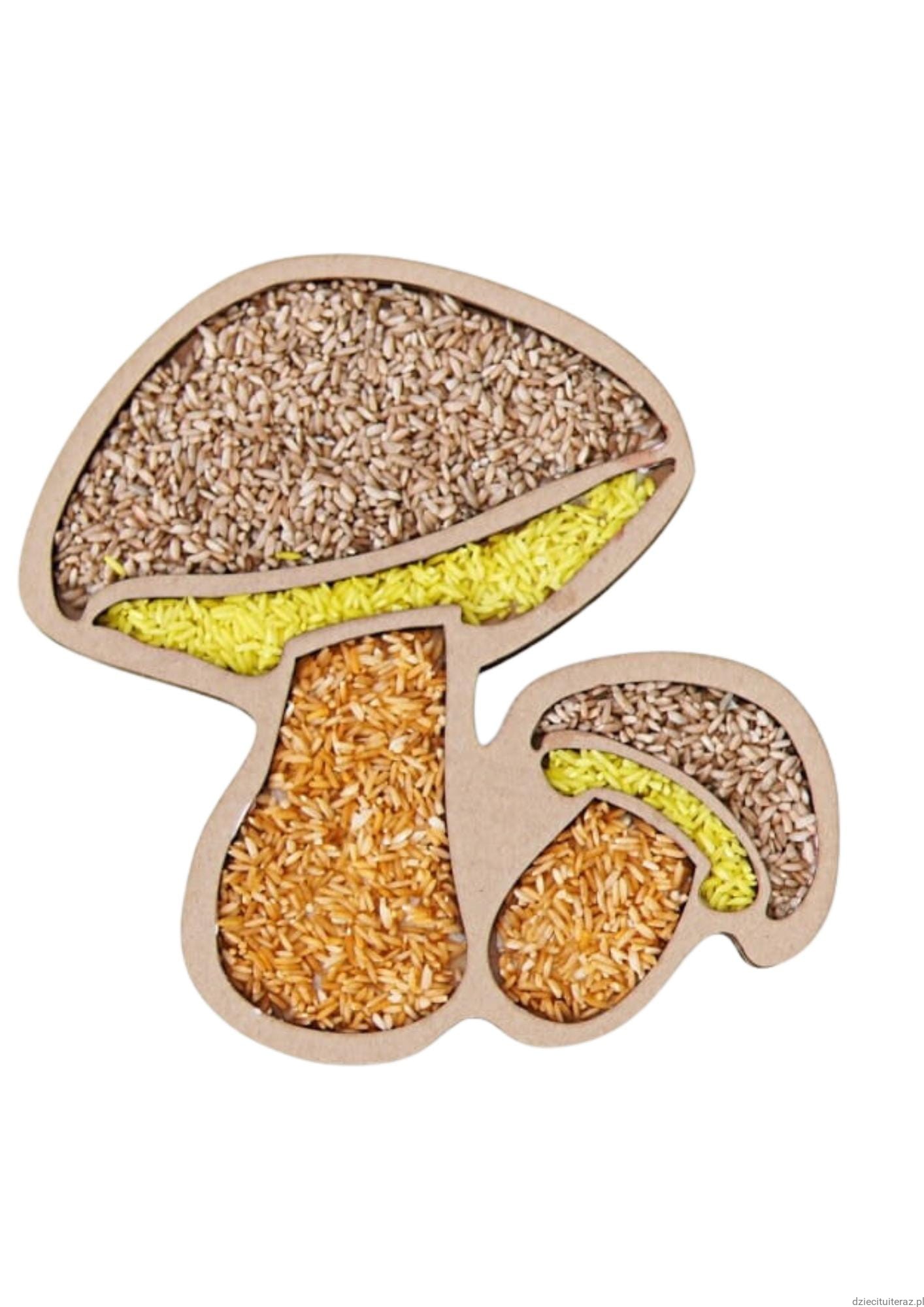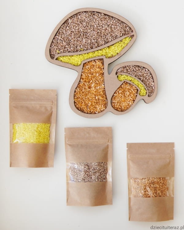Zestaw składa się z kartonowej wysypywanki w kształcie dwóch grzybków oraz trzech opakowań barwionego ryżu.
