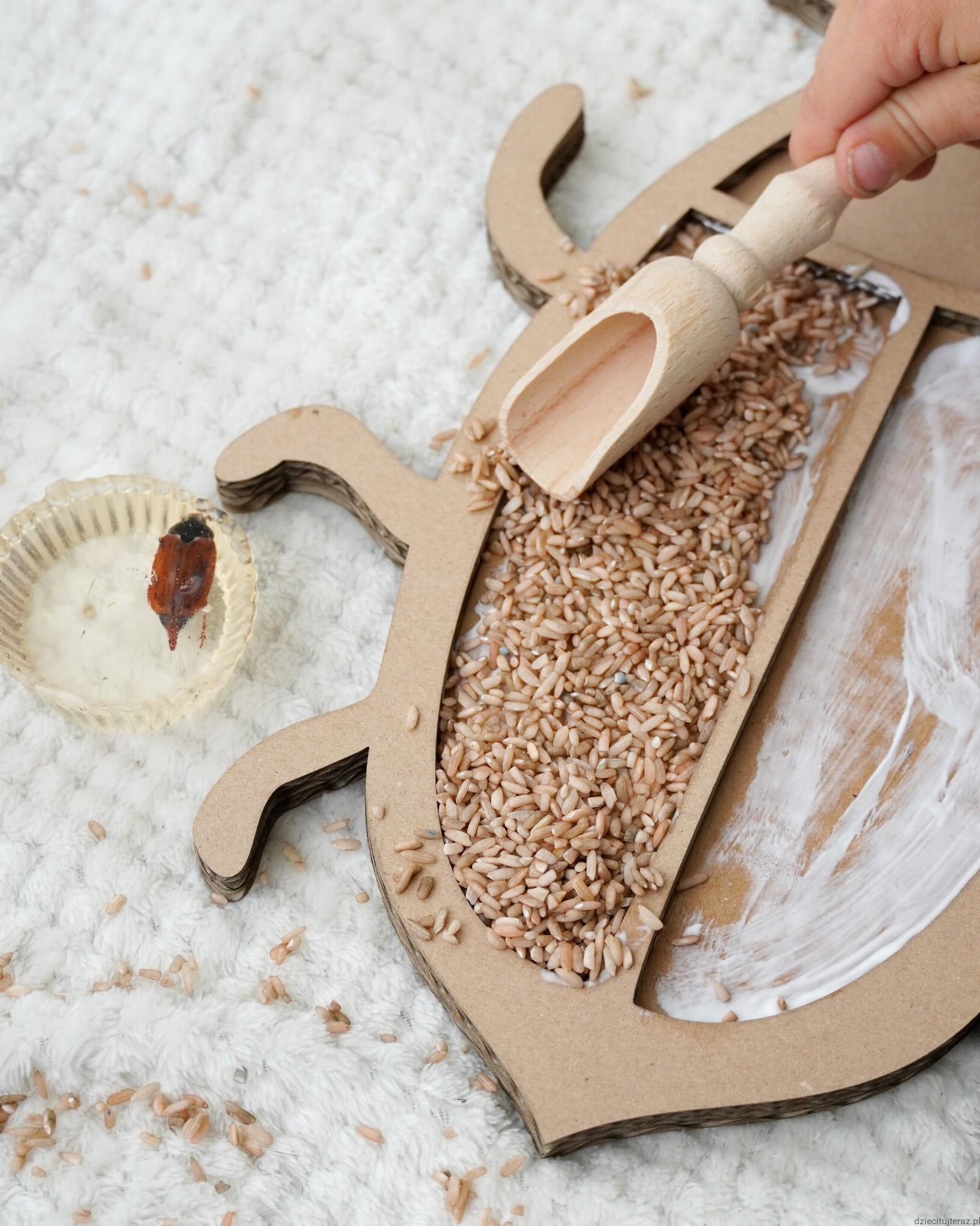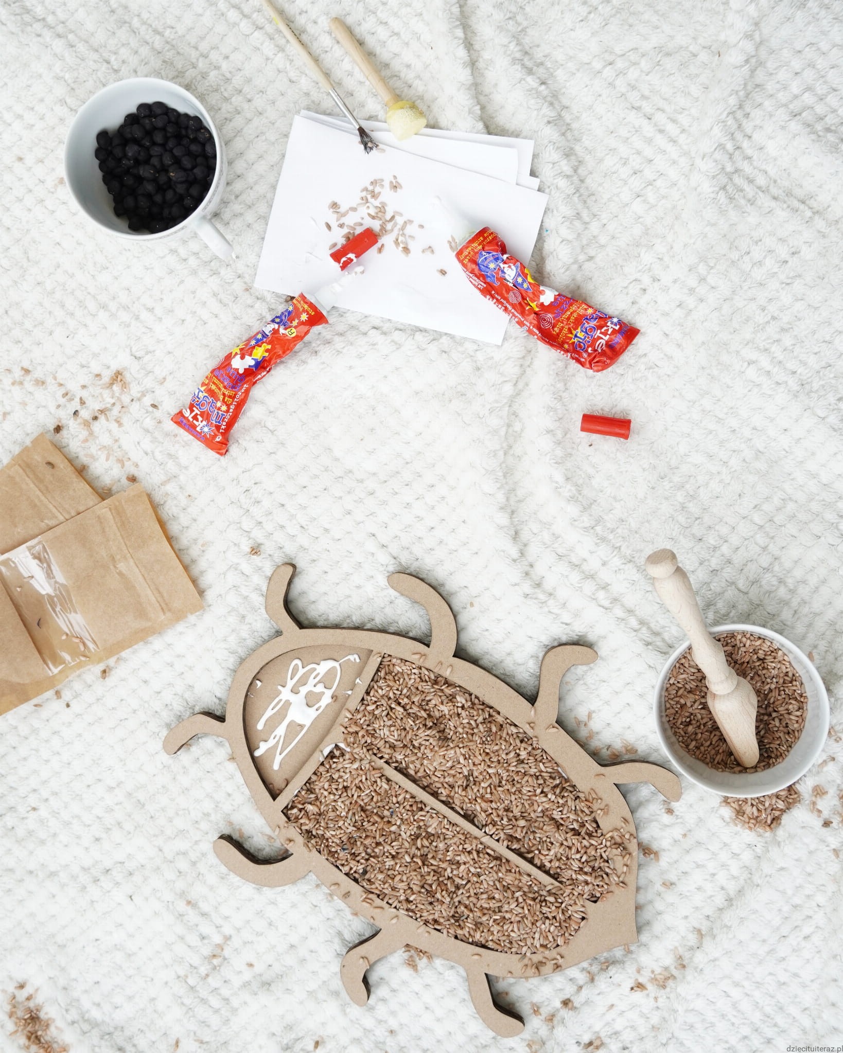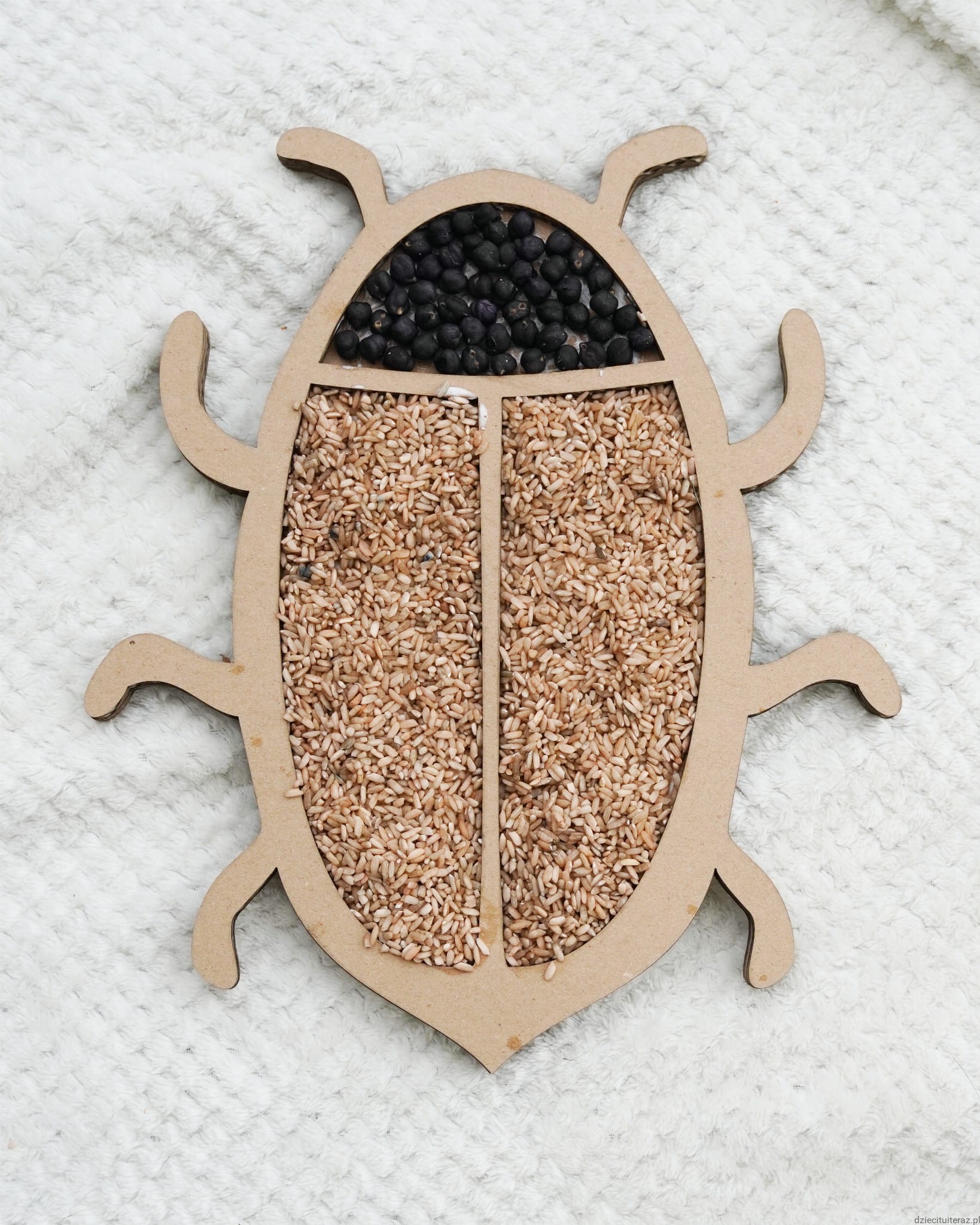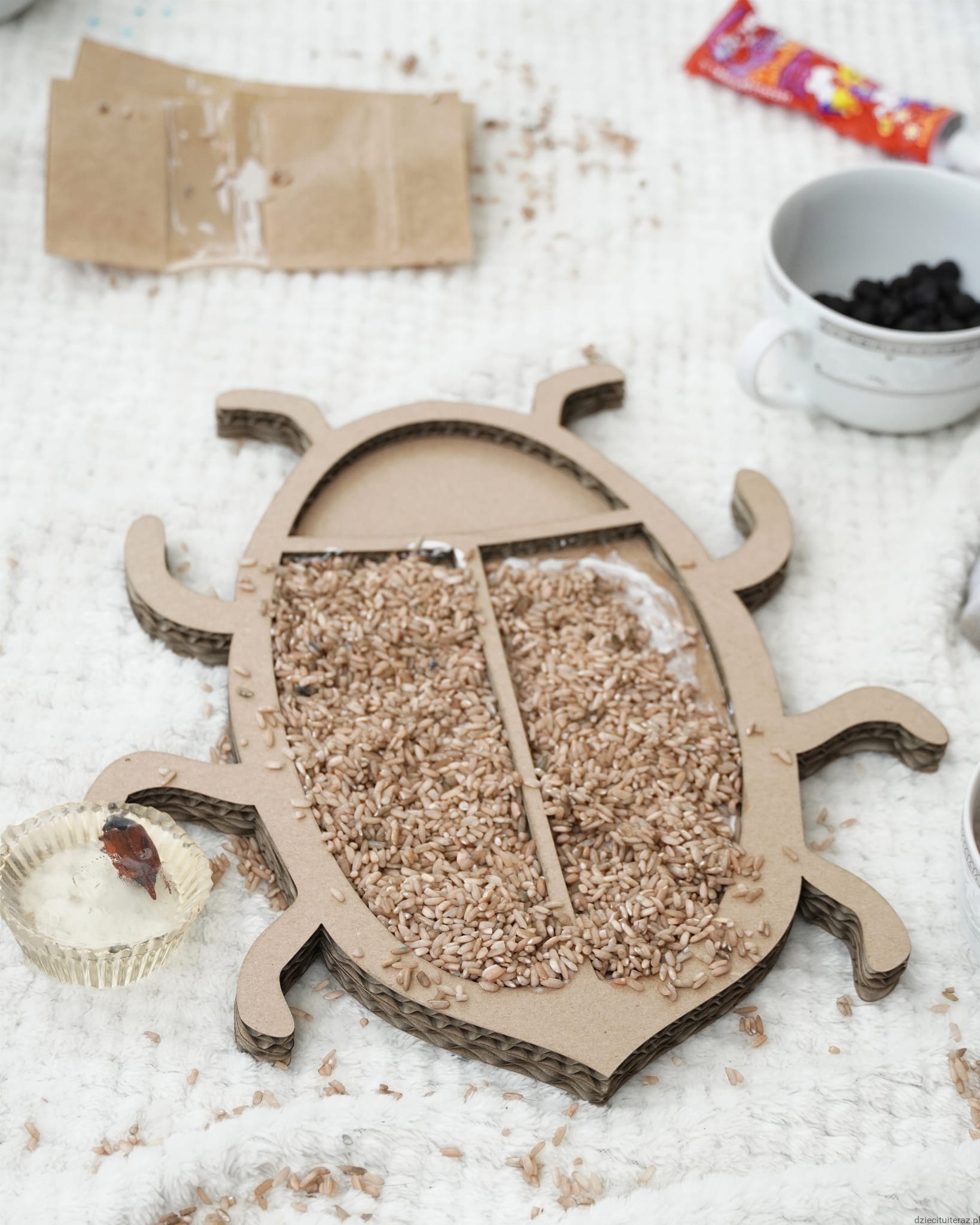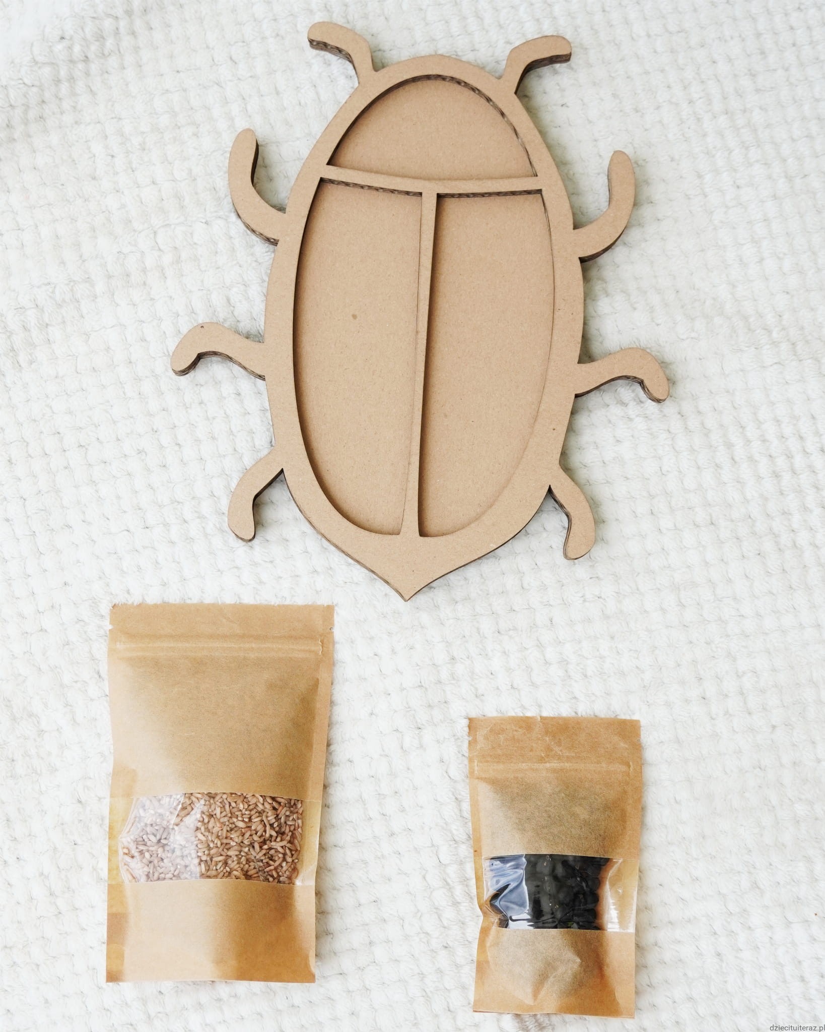 Zestaw składa się z kartonowego modelu chrabąszcza oraz jednego opakowania barwionej ciecierzycy i jednego opakowania barwionego ryżu. Zestaw zawiera 60g barwionych nasion ciecierzycy w kolorze czarnym oraz 150g ryżu w kolorze brązowym. Nasiona ciecierzycy i ryżu są barwione bezpiecznymi barwnikami spożywczymi.