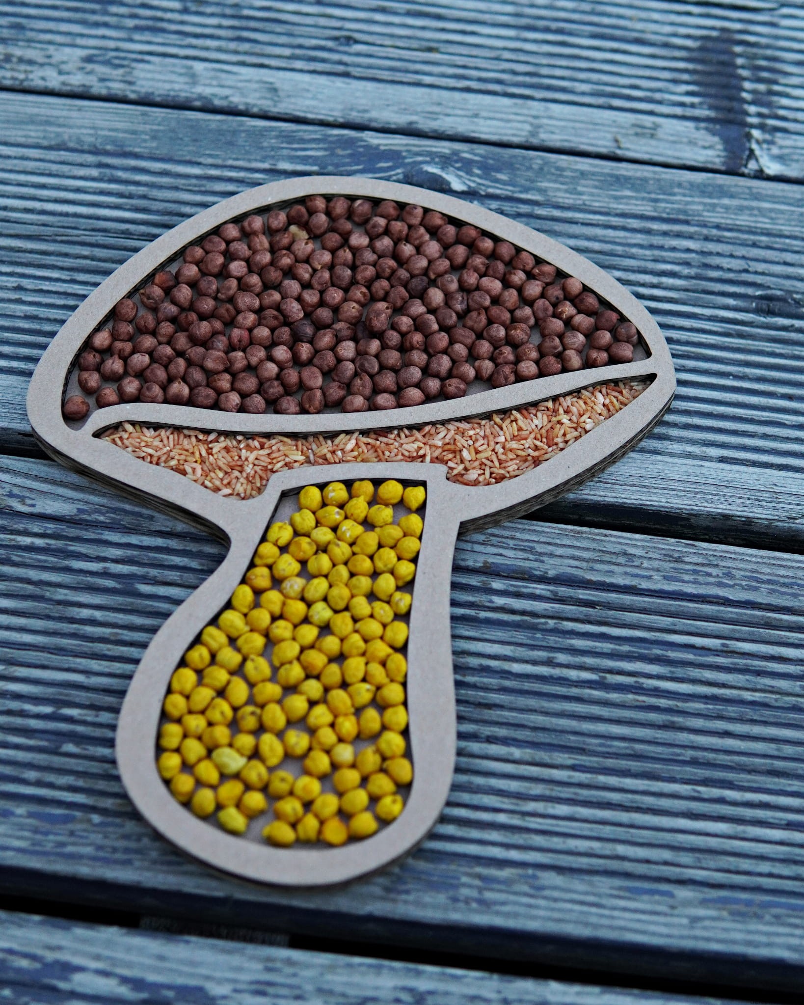 Zestaw składa się z kartonowej wysypywanki w kształcie grzybka jednego opakowania barwionego ryżu oraz dwóch opakowań barwionej ciecierzycy.