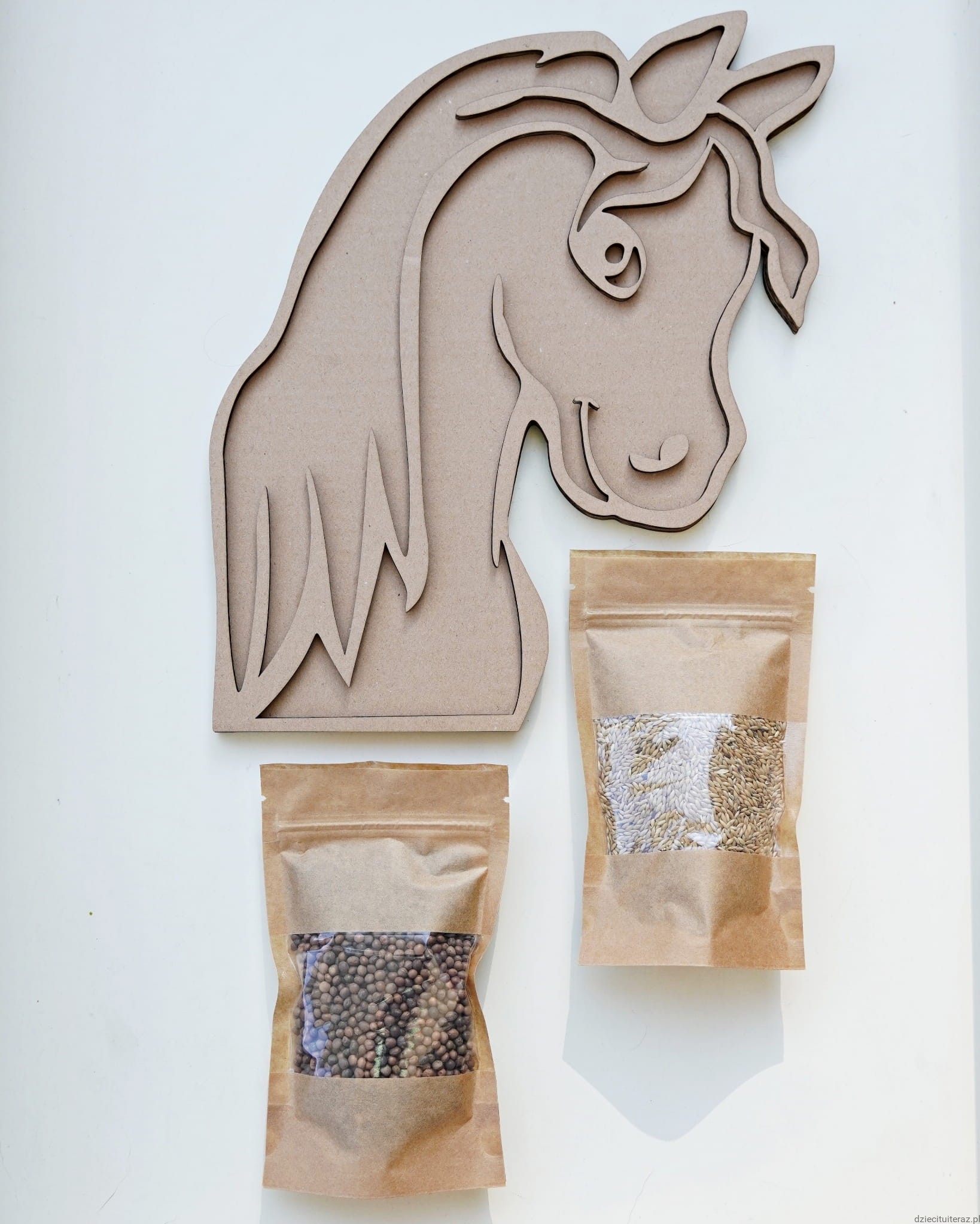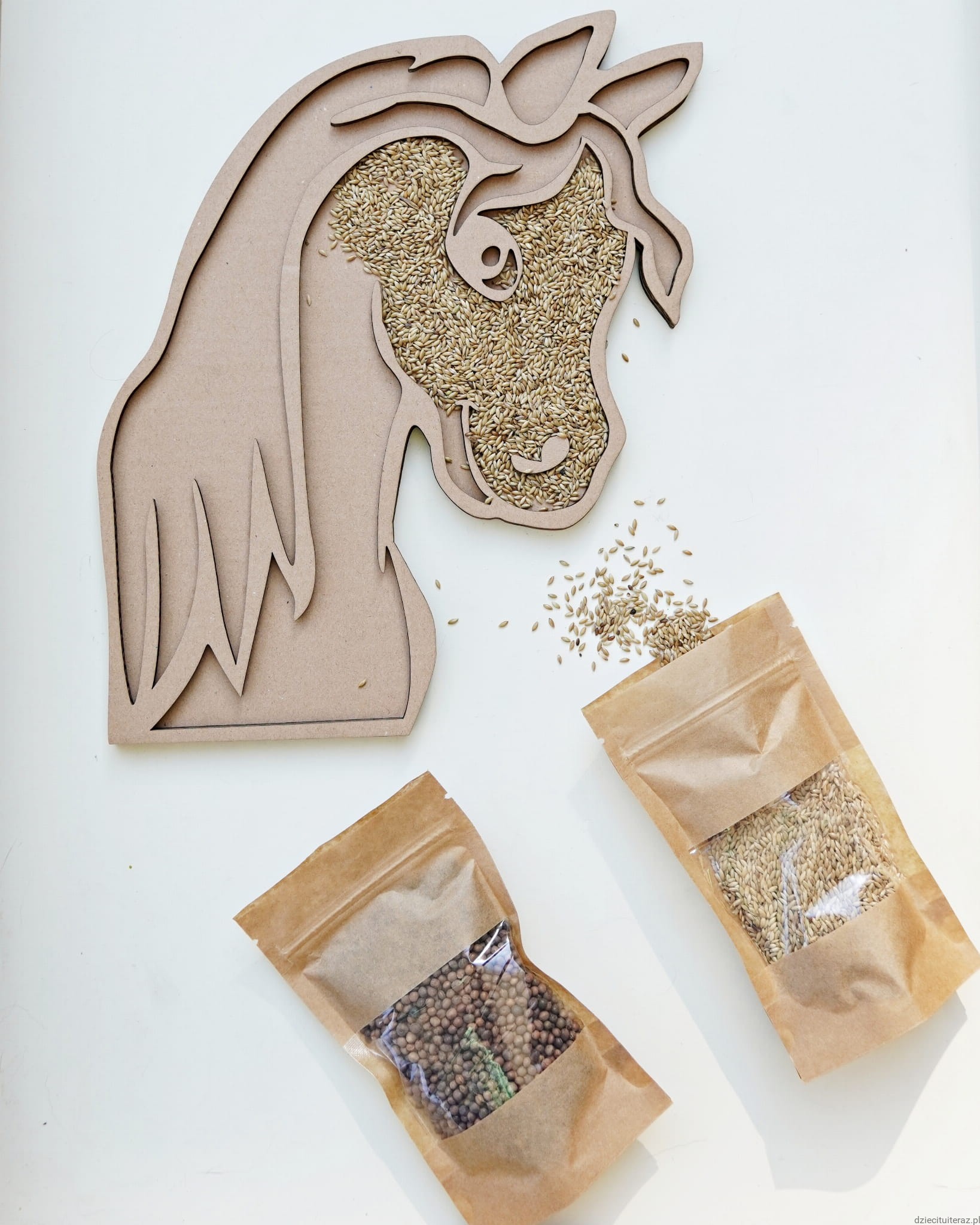 Zestaw składa się z kartonowego modelu konia, jednego opakowania wyki, jednego opakowania kanaru oraz nabieraka i kleju Magic.