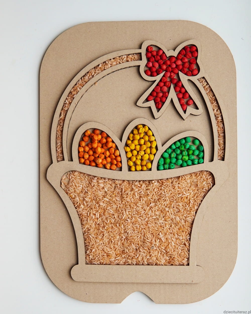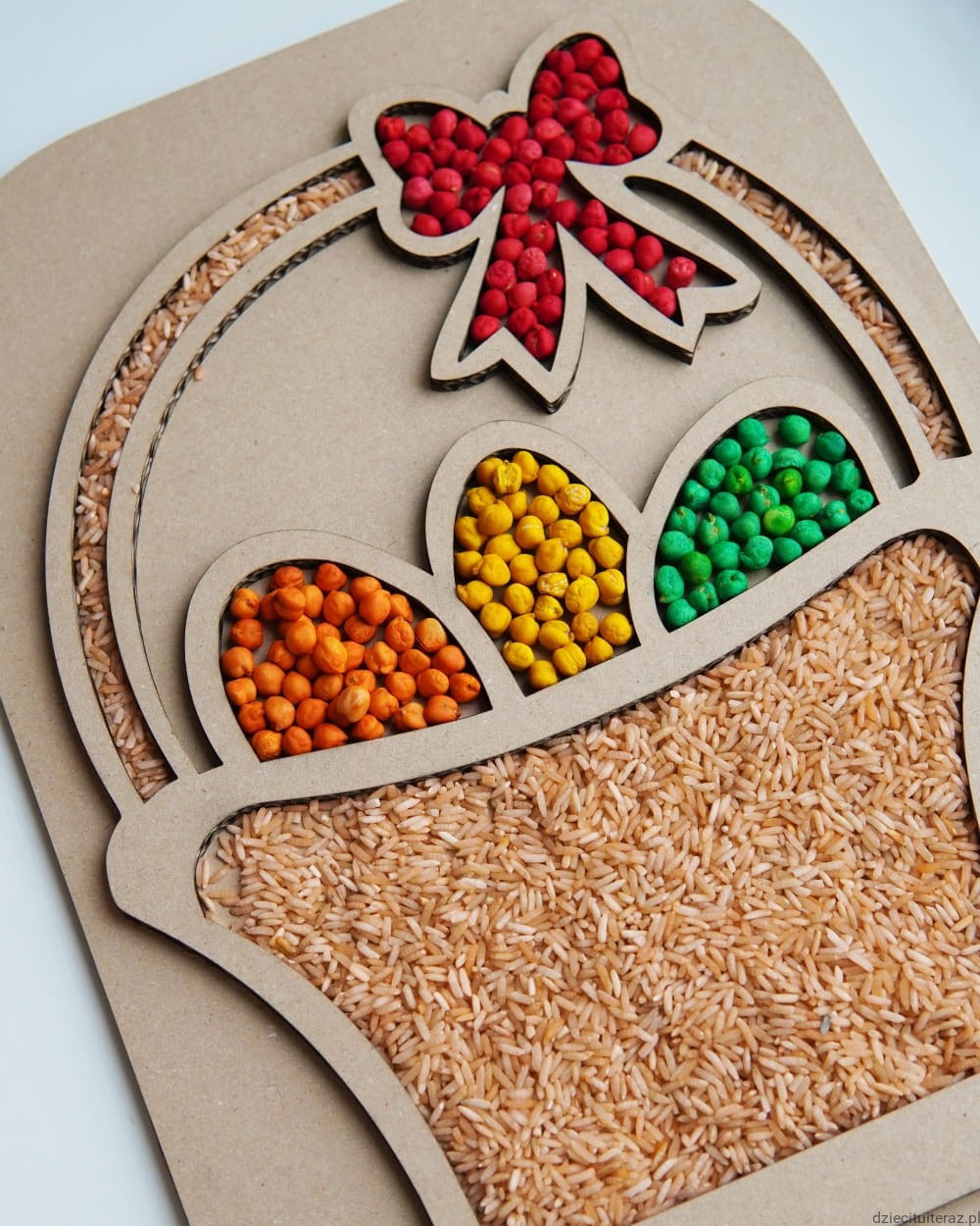 Zestaw składa się z kartonowej wysypywanki sensorycznej oraz jednego opakowania barwionej ciecierzycy i jednego opakowania barwionego ryżu.