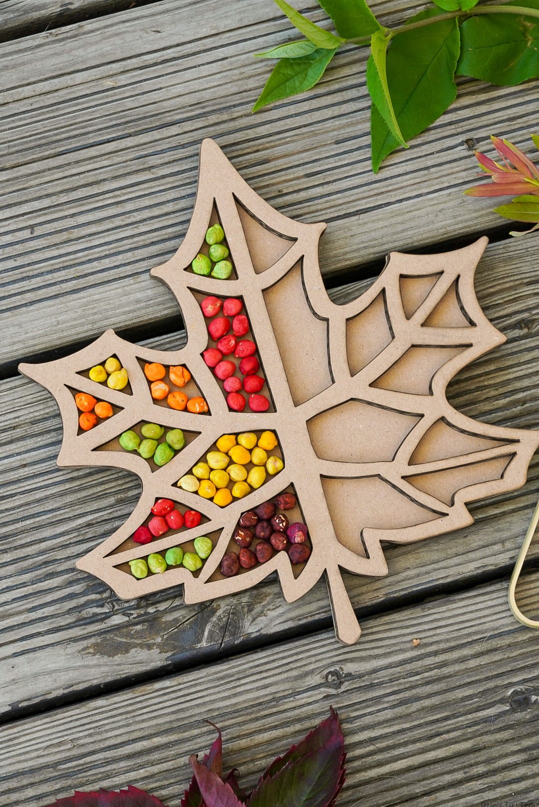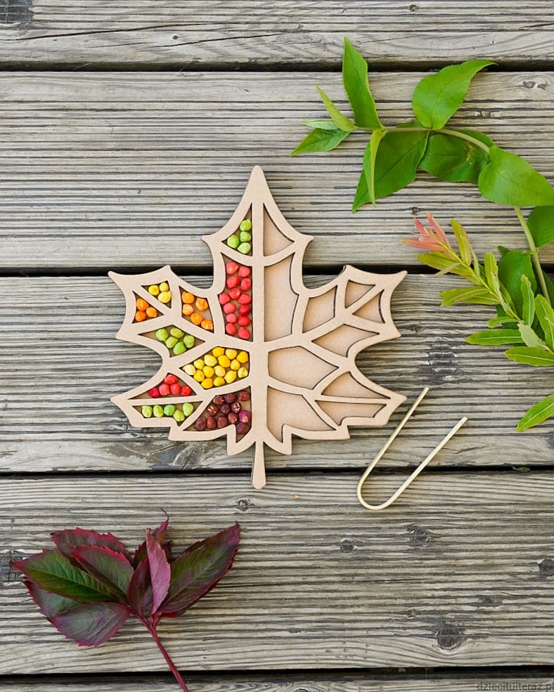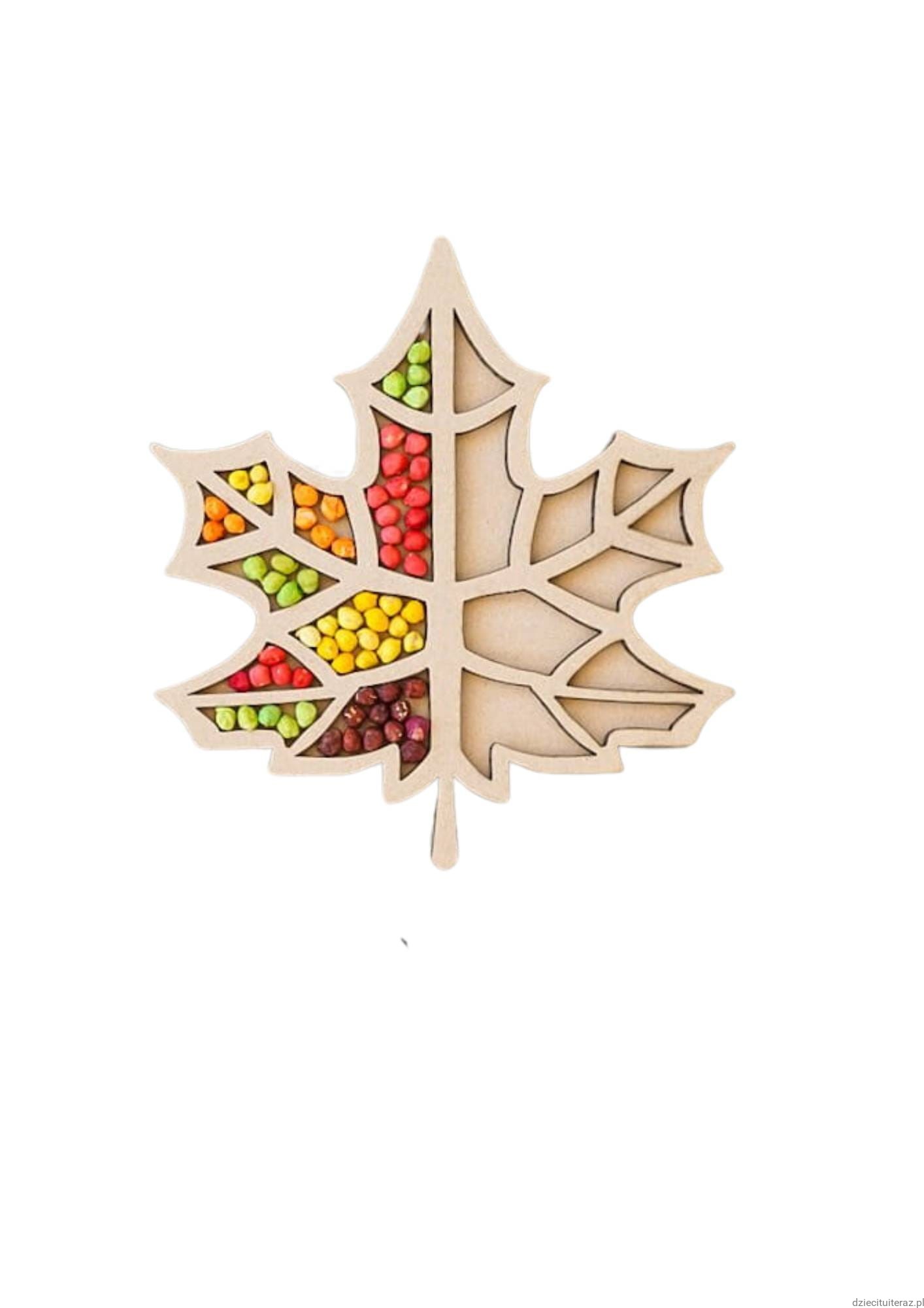 Zestaw składa się z kartonowej wysypywanki w kształcie liścia klonu oraz opakowania barwionej ciecierzycy.