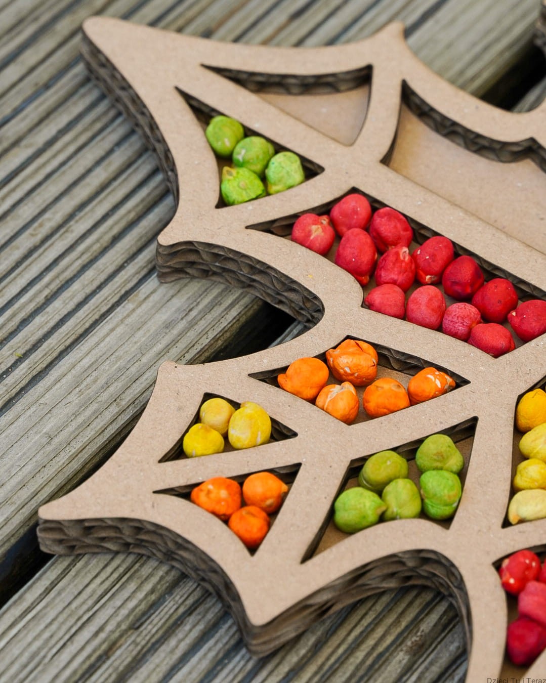 - 150g barwionej naturalnymi barwnikami spożywczymi ciecierzycy w kolorach: żółtym, czerwonym, pomarańczowym, brązowym i zielonym,