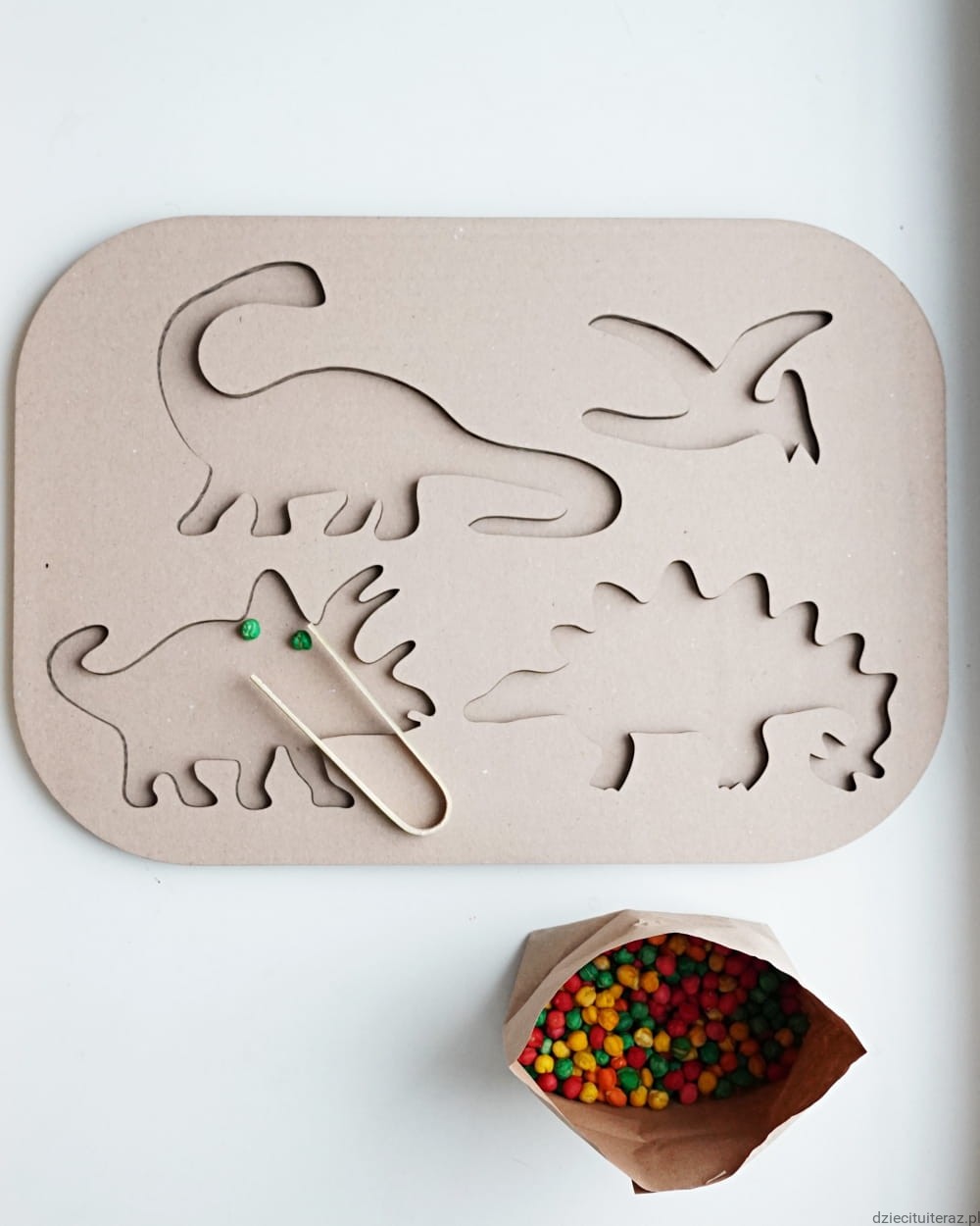 Zestaw składa się z kartonowej wysypywanki sensorycznej oraz jednego opakowania barwionej ciecierzycy.