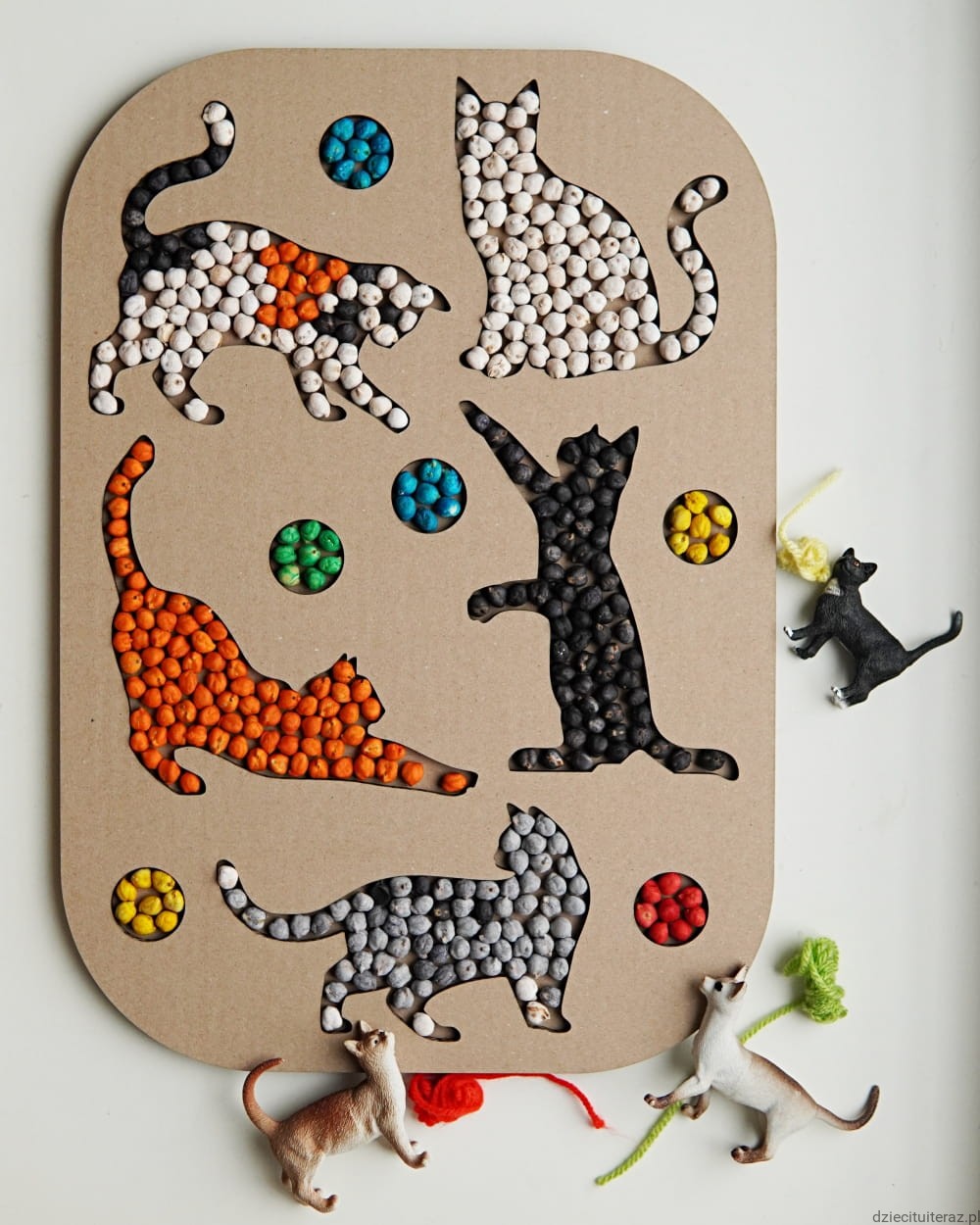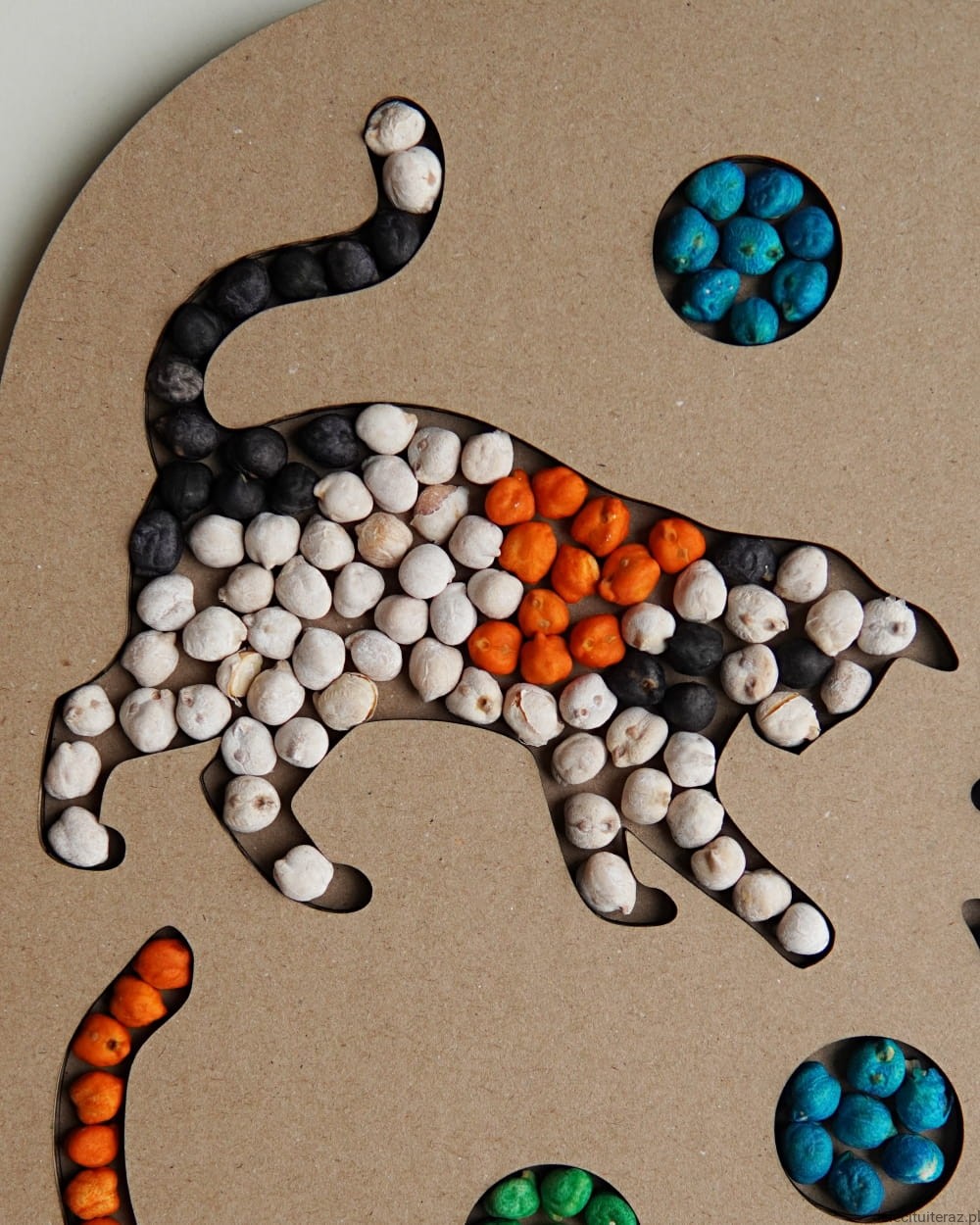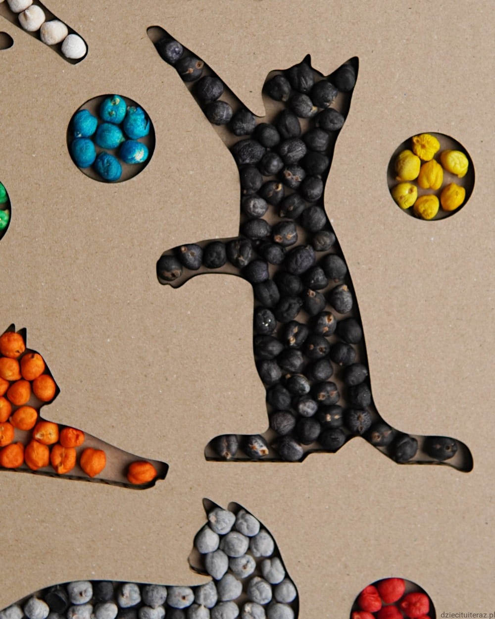 Zestaw składa się z kartonowej wysypywanki z kotkami oraz jednego opakowania barwionej ciecierzycy.