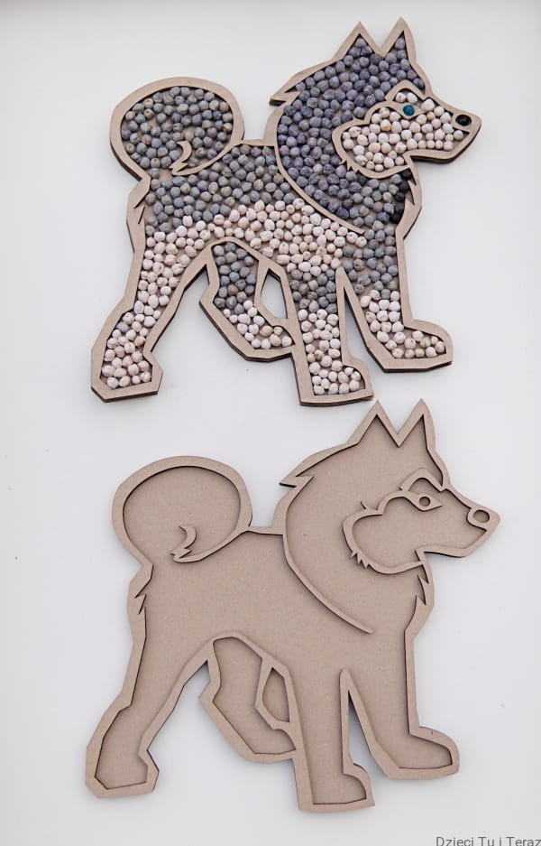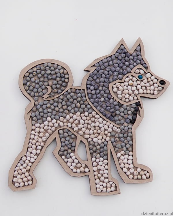 Zestaw składa się z kartonowego modelu psa oraz dwóch opakowań barwionej ciecierzycy. Zestaw zawiera 200g ciecierzycy w kolorze czarnym i szarym oraz 200g ciecierzycy w kolorze białym. Nasiona są barwione bezpiecznymi barwnikami spożywczymi.