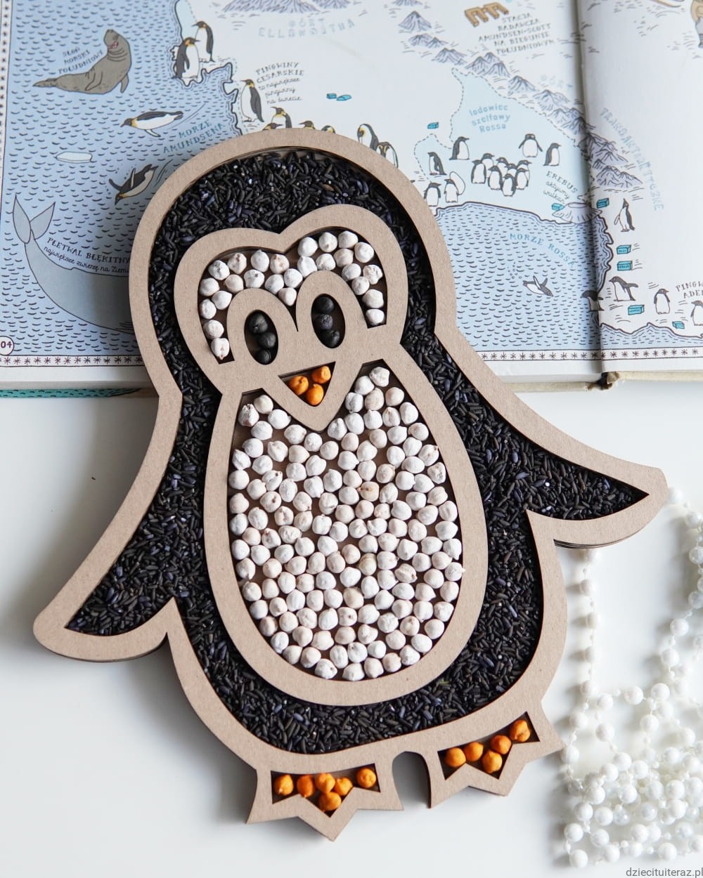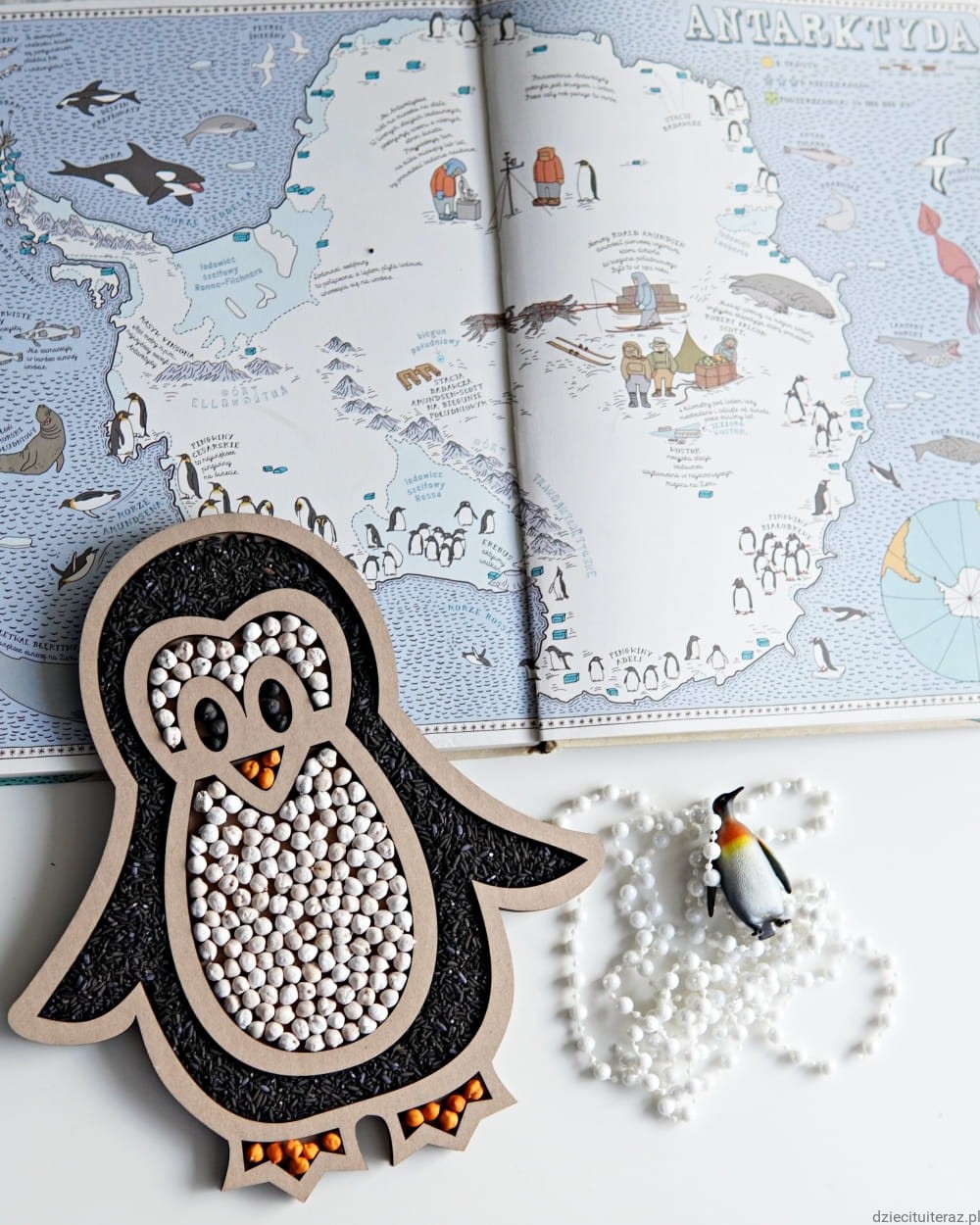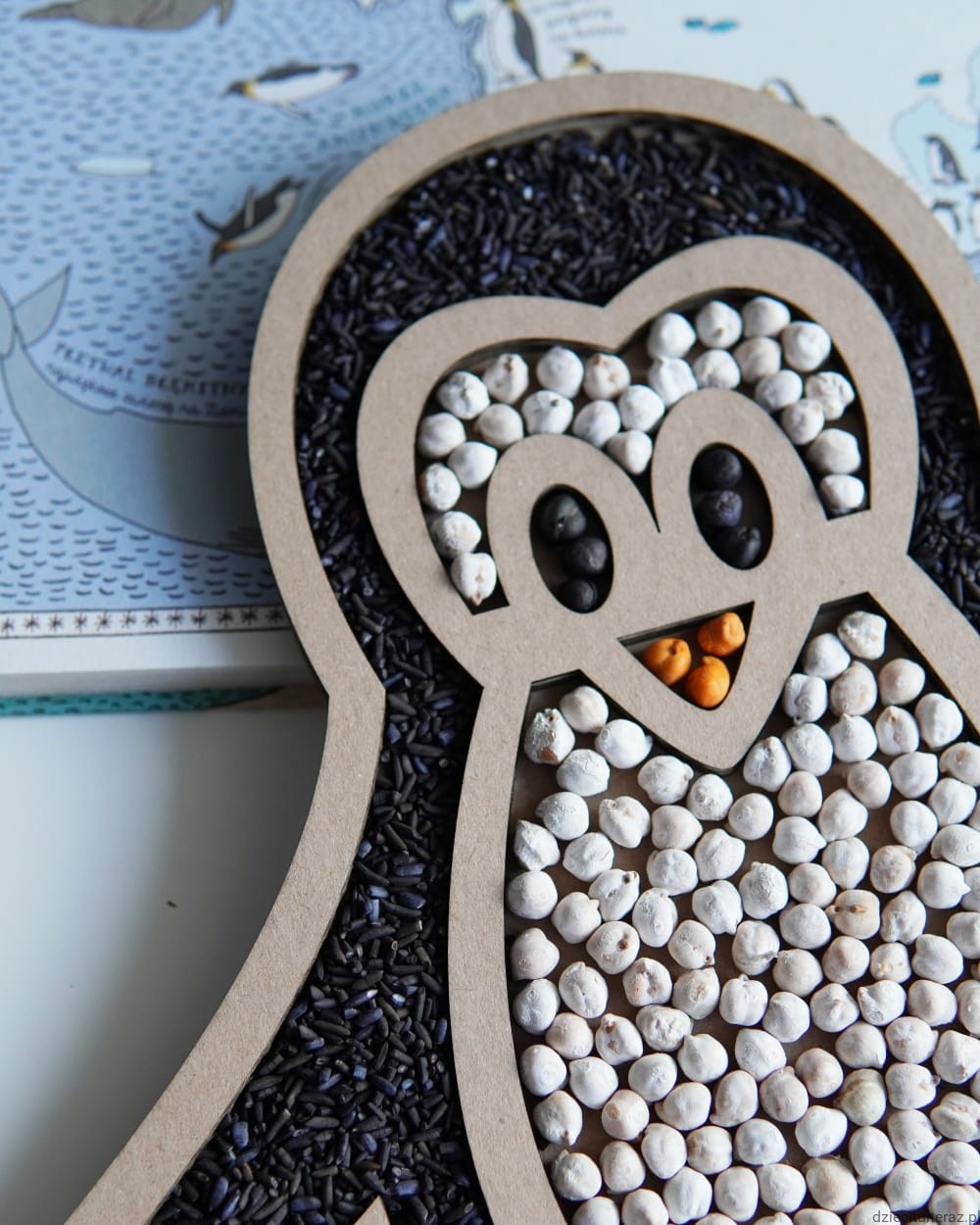 Zestaw składa się z kartonowej wysypywanki w kształcie pingwina, jednego opakowania barwionej ciecierzycy oraz jednego opakowania barwionego ryżu.