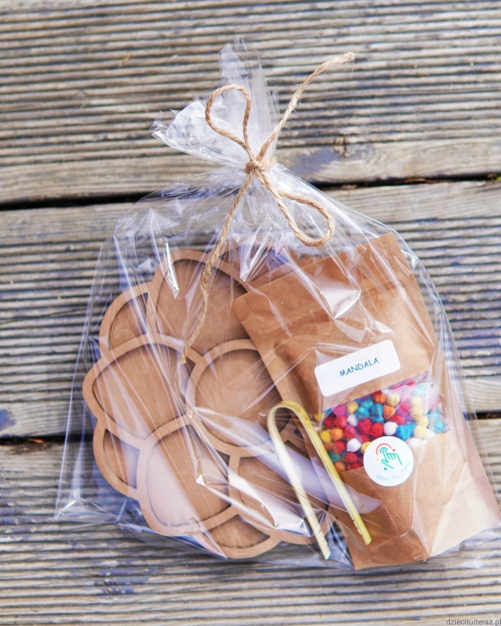 Produkt zapakowany w celofan i zawiązany sznurkiem.