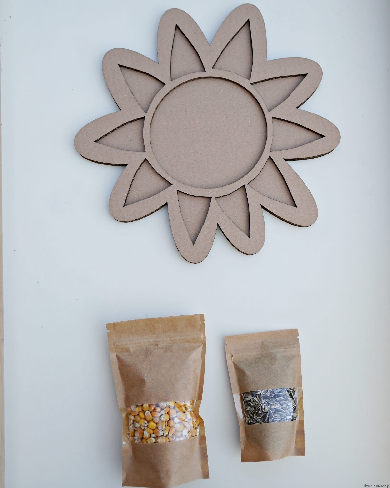 Zestaw składa się z kartonowego modelu słonecznika oraz dwóch opakowań naturalnych ziaren. Zestaw zawiera naturalne nasiona słonecznika 50g, naturalne nasiona kukurydzy 200g lub naturalną kaszę jaglaną 200g.