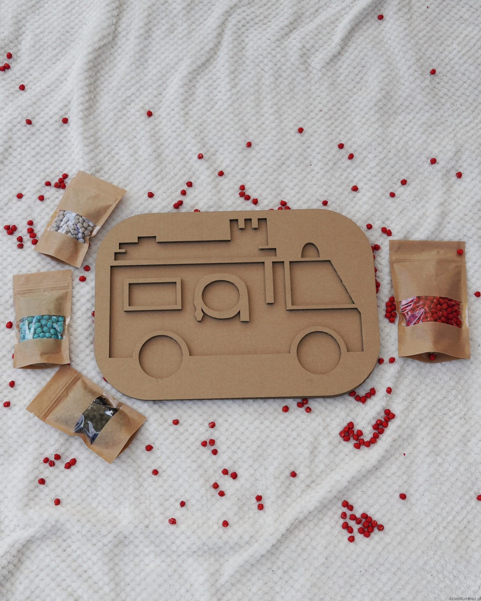 - kartonowego modelu straży pożarnej z drabiną z owalną podkładką o wymiarach 39,5cm x 27,5cm (gruba tektura dwuwarstwowa)