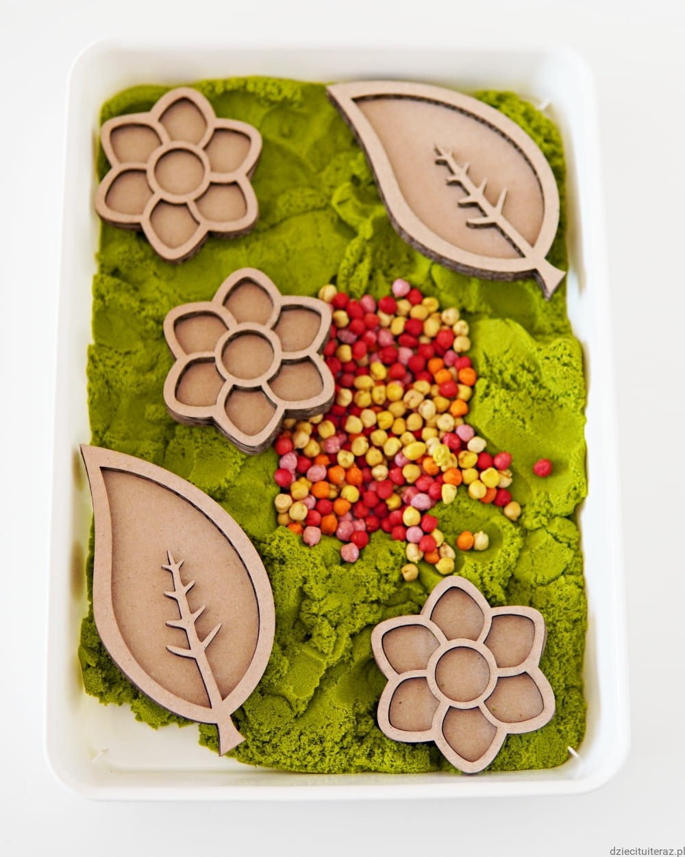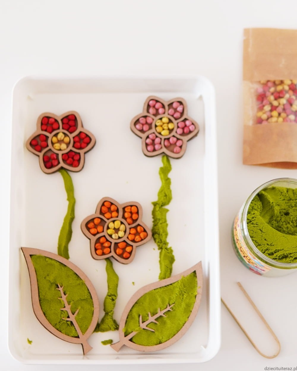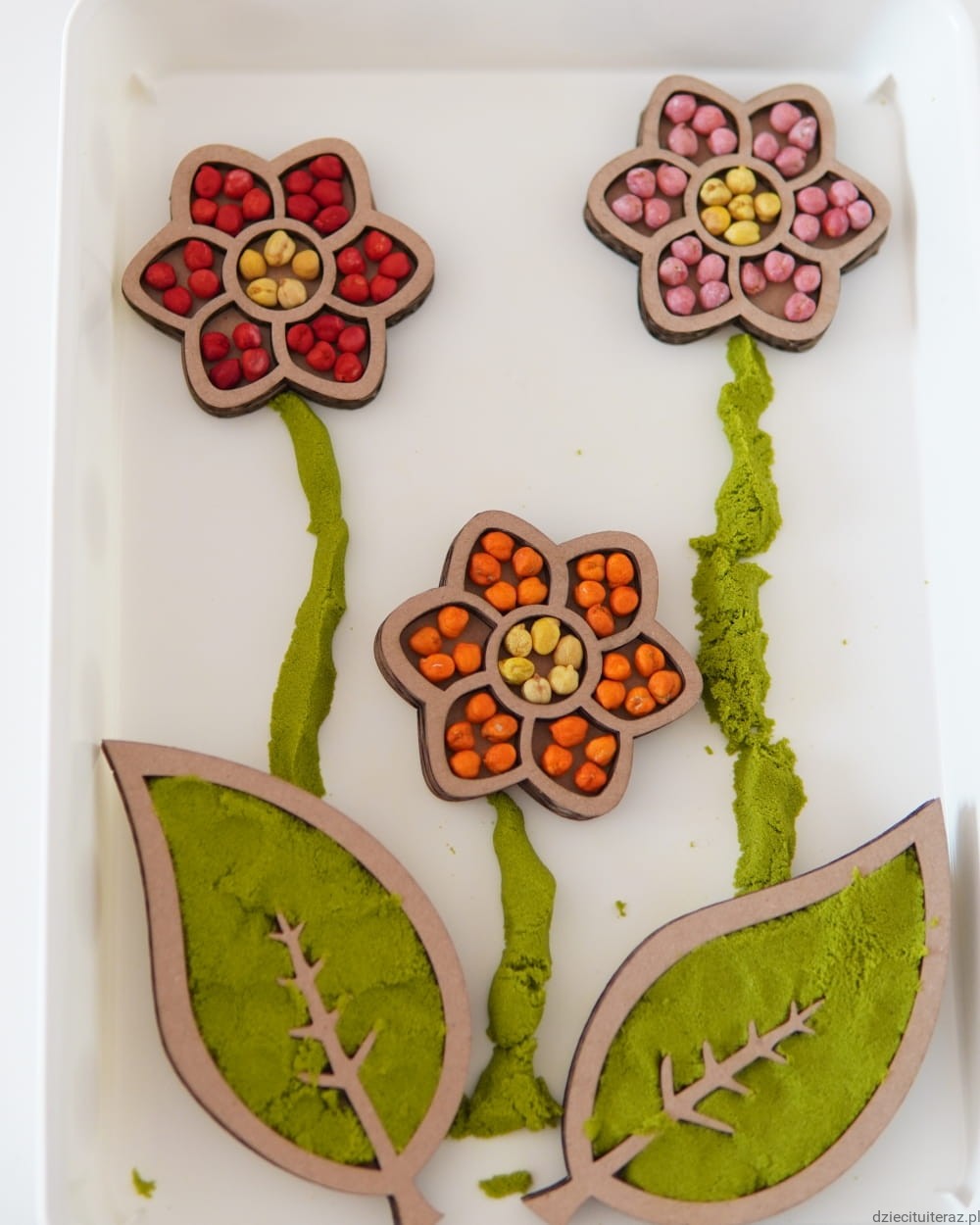 Masę i ziarenka przesyp do pojemnika, ułóż kwiaty oraz listki i tak przygotowane daj dziecku do zabawy.