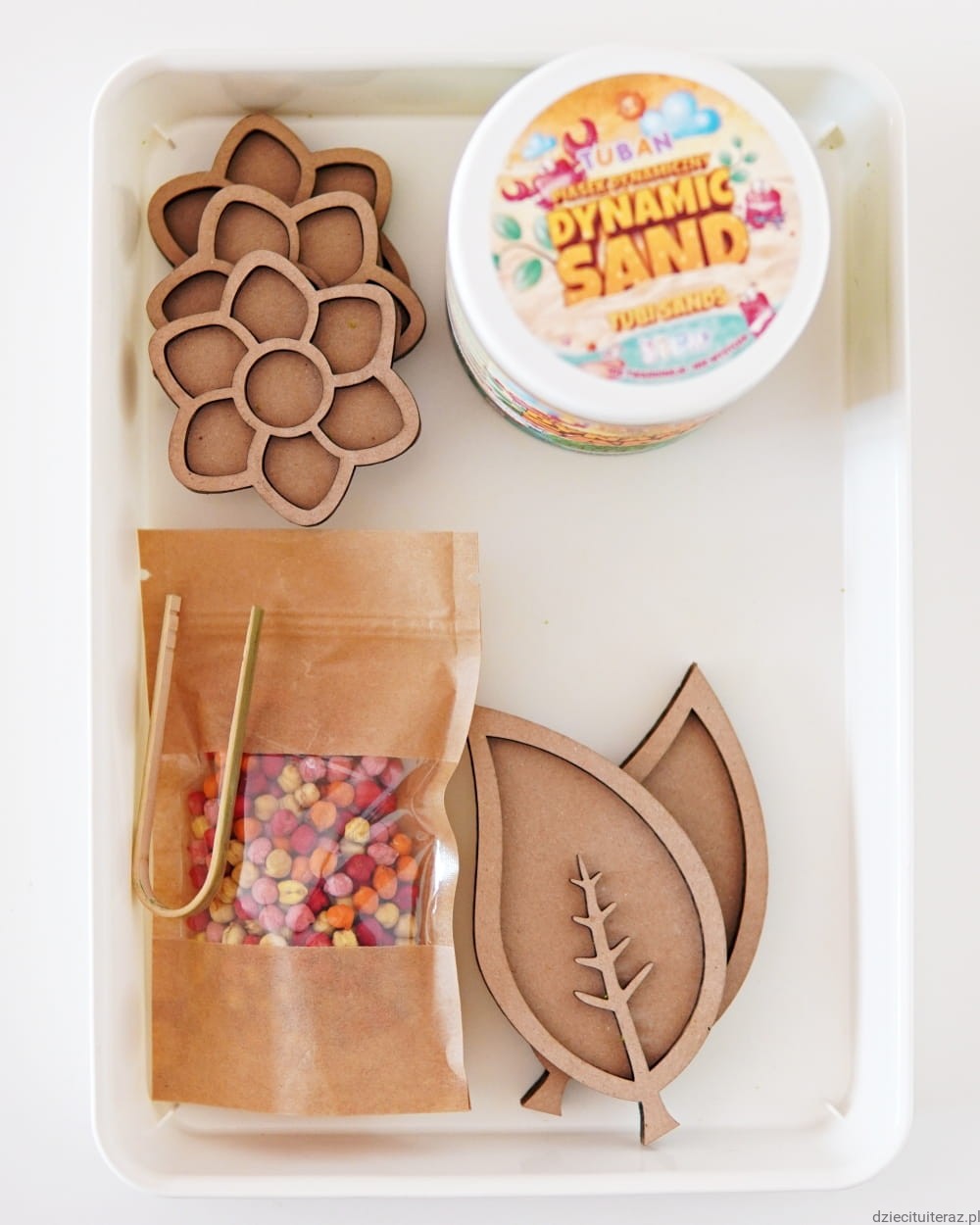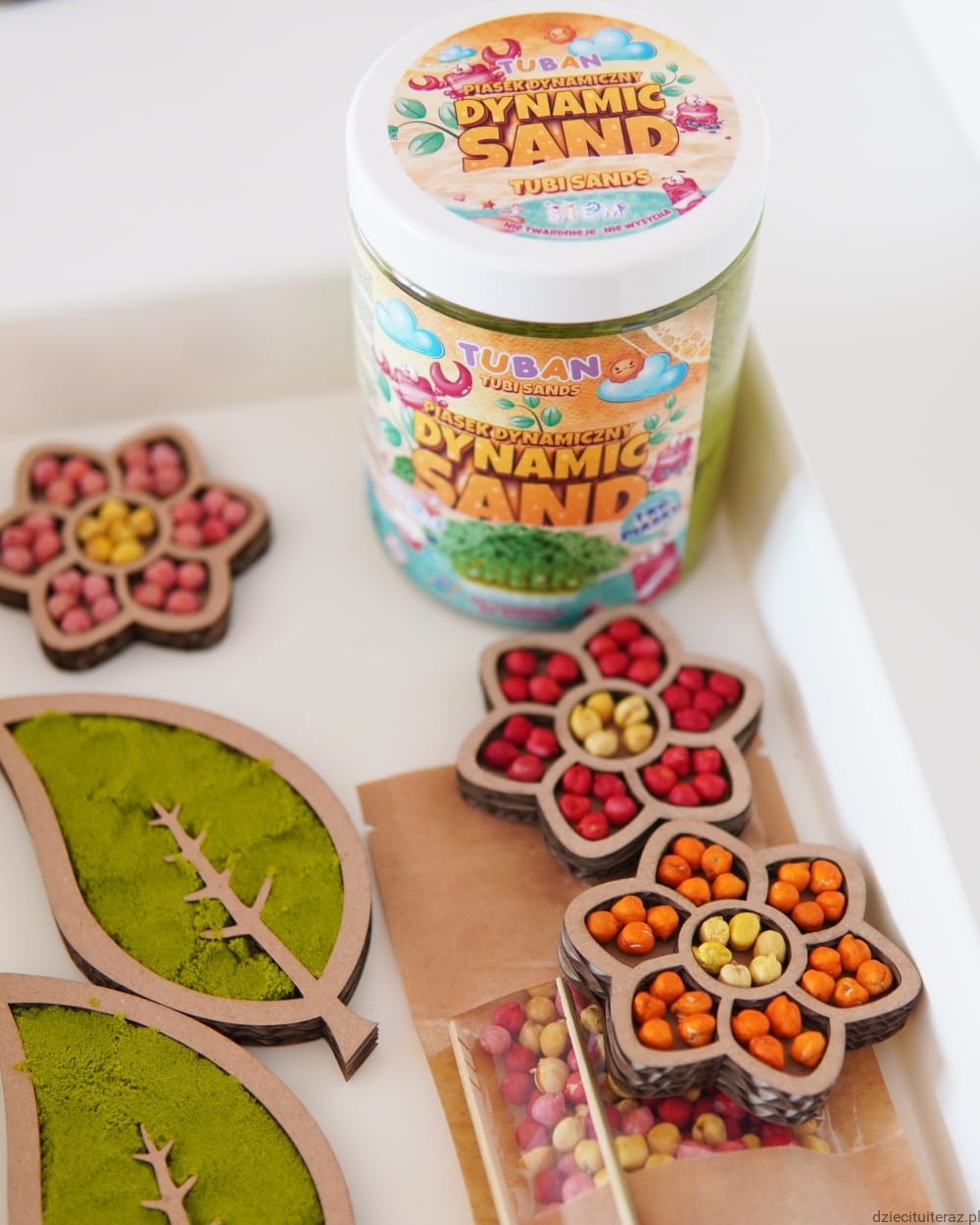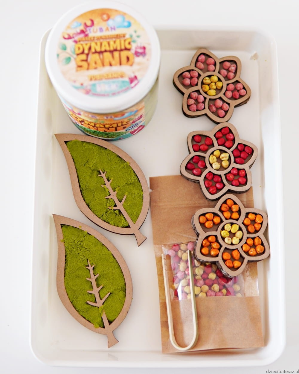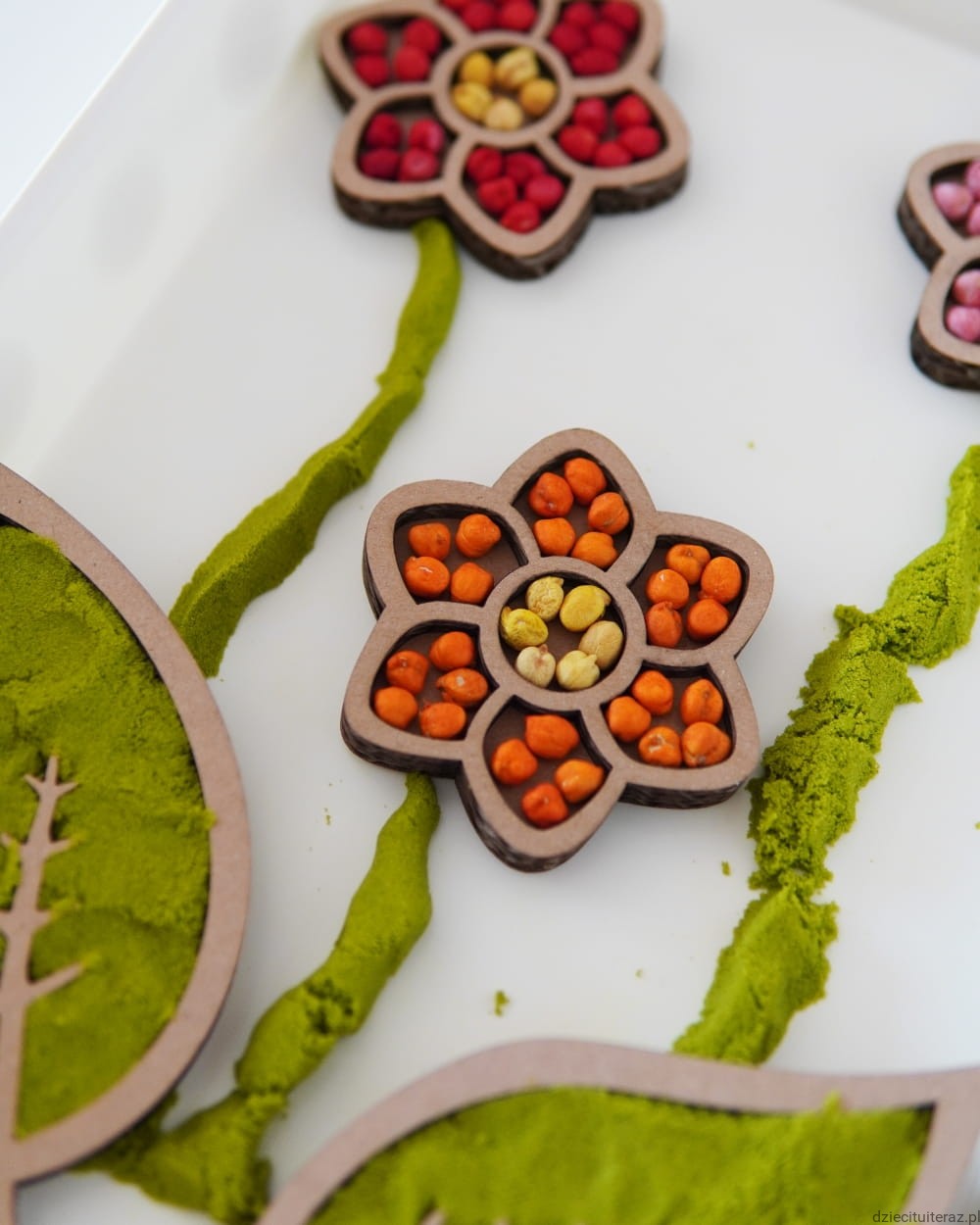 Masę i ziarenka przesyp do pojemnika, ułóż kwiaty oraz listki i tak przygotowane daj dziecku do zabawy.