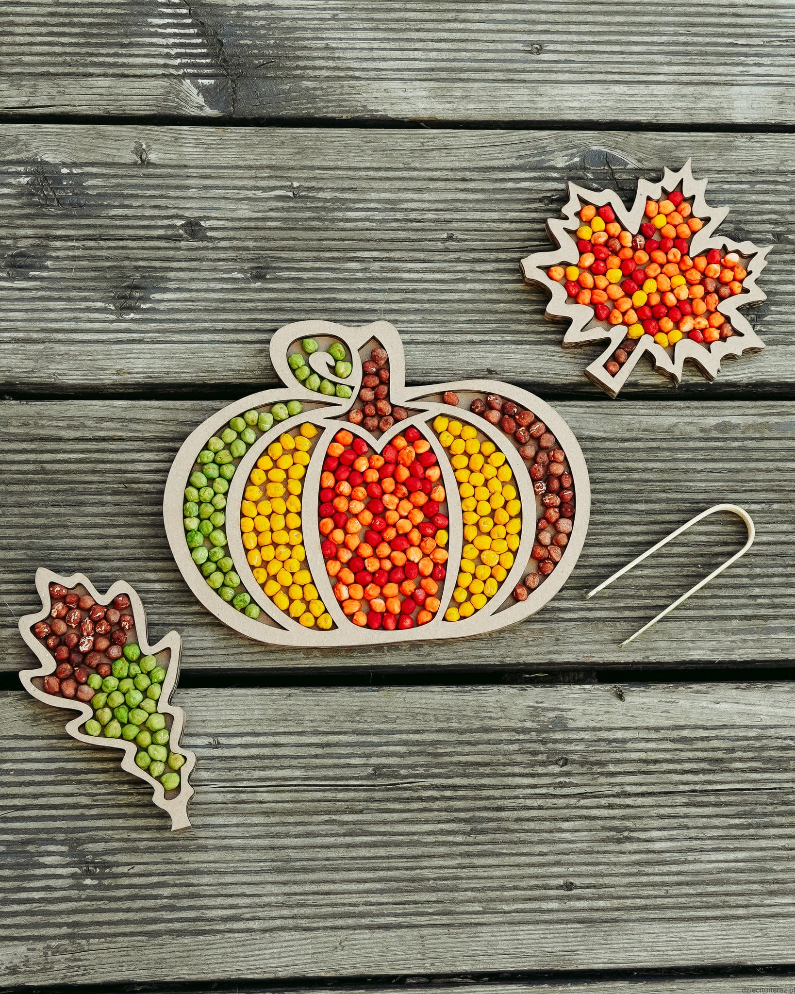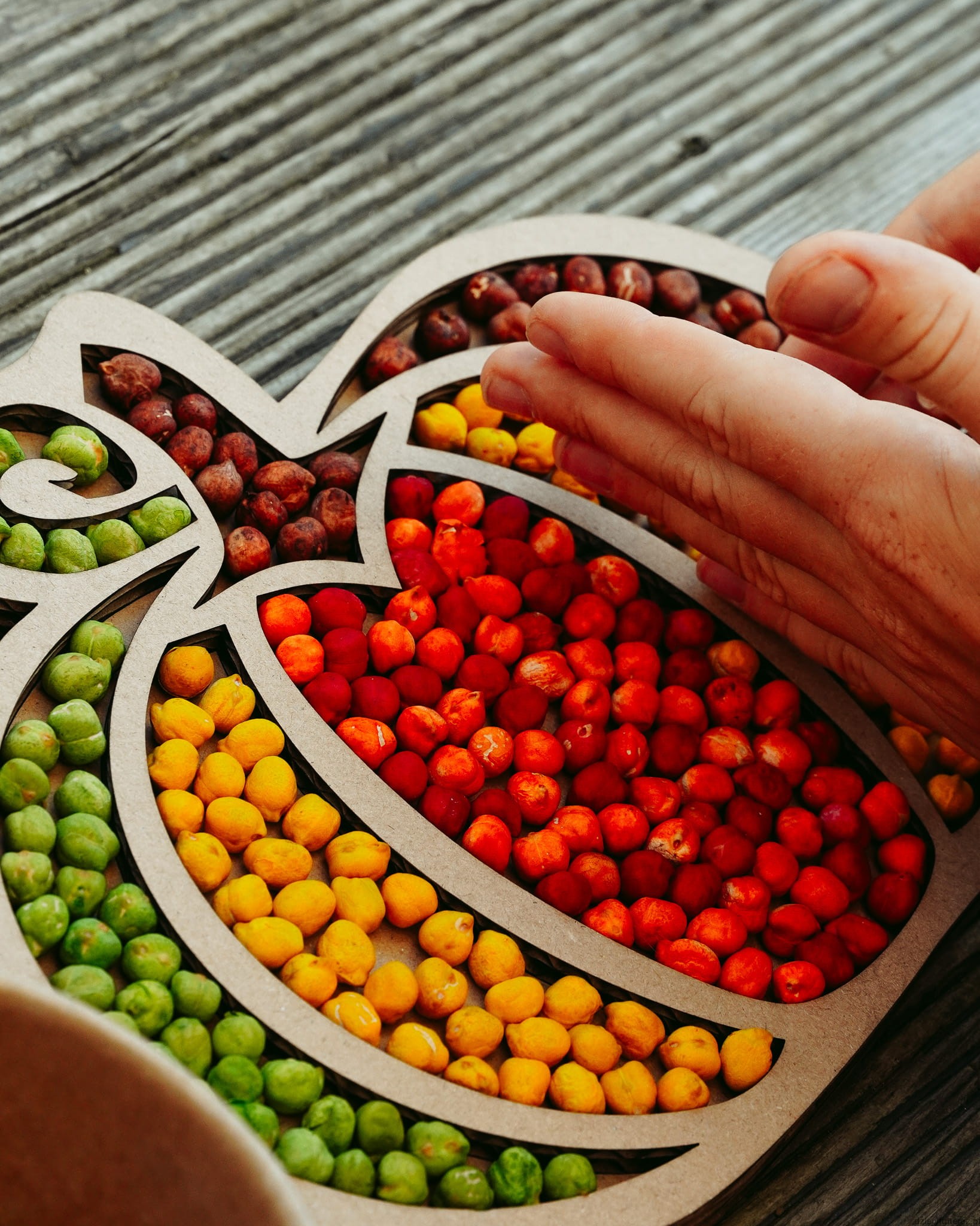 - naturalne nasiona ciecierzycy barwione pomarańczowym, brązowym, żółtym, czerwonym i zielonym barwnikiem spożywczym w sumie 150g