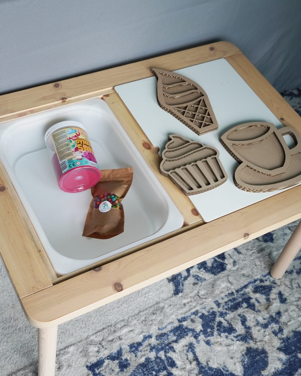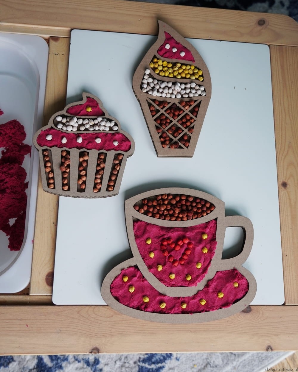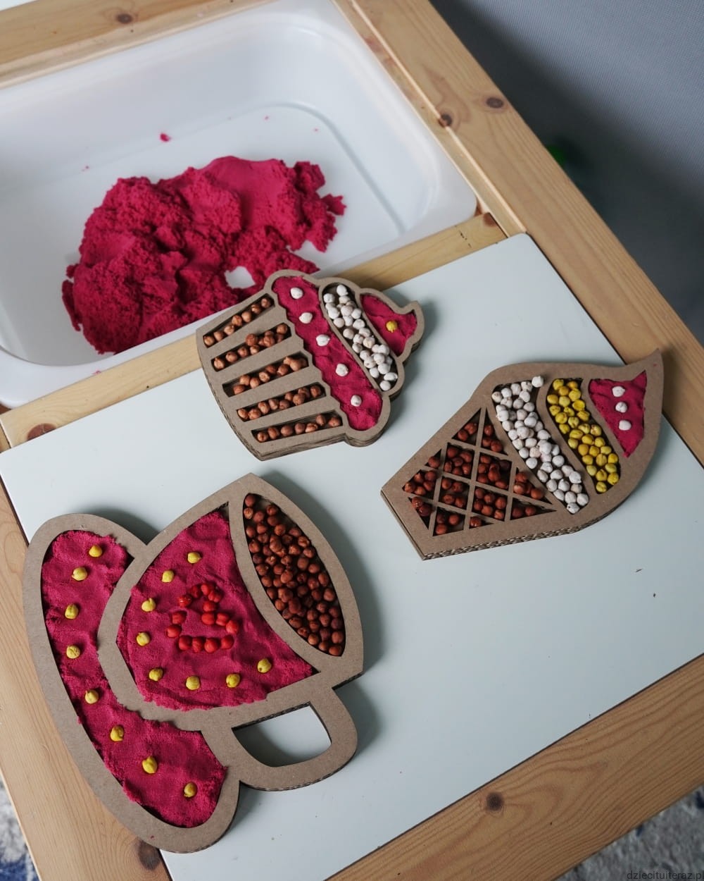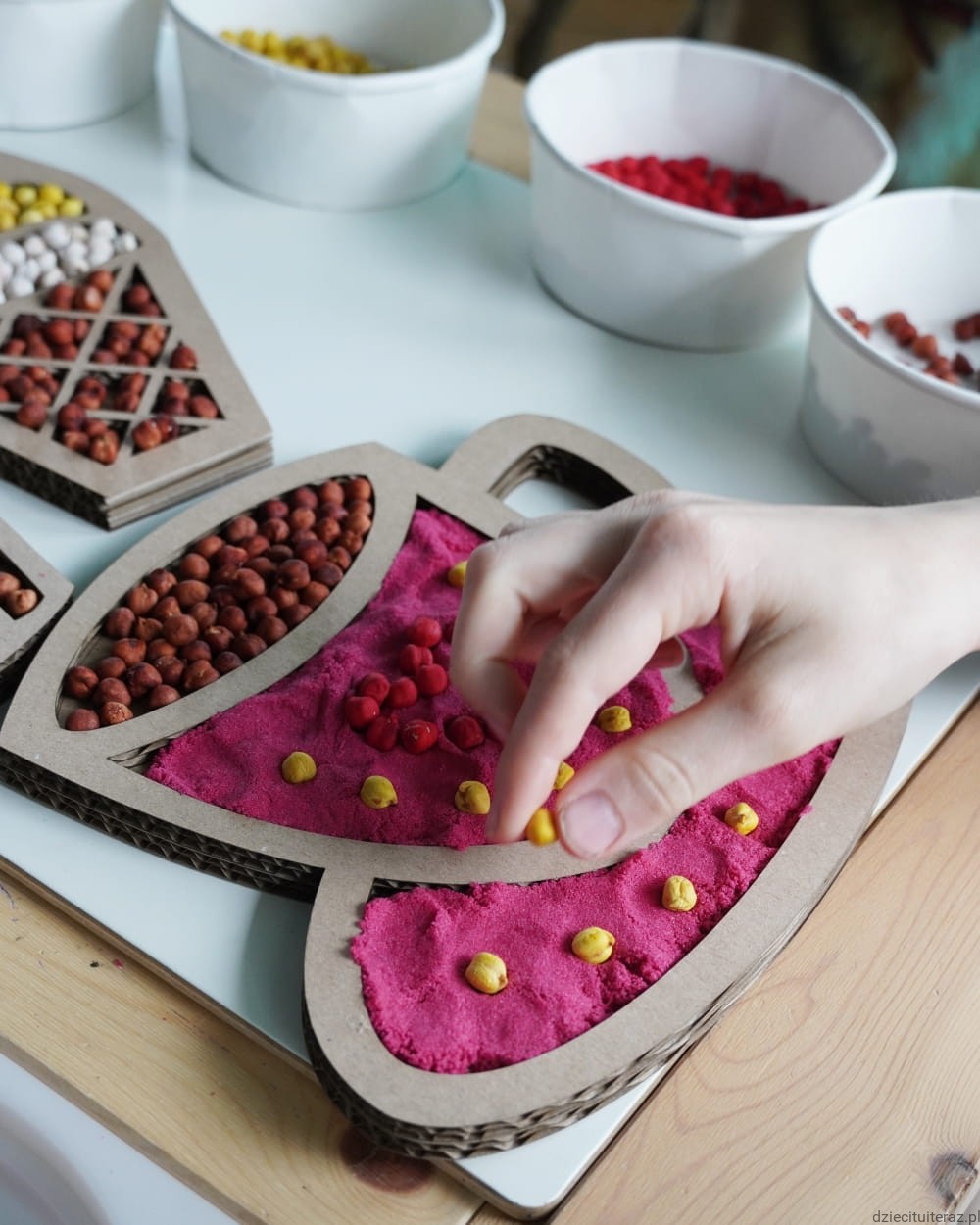 Masę i ziarenka przesyp do pojemnika, ułóż sensokartony i tak przygotowane daj dziecku do zabawy.
